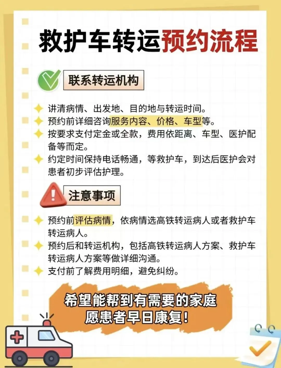 | 市内短途转运 | 起步价400–800元(含10公里内)超里程费 8–12元/公里 | 如需使用呼吸机、监护仪等特殊设备,请提前告知以便安排 |
