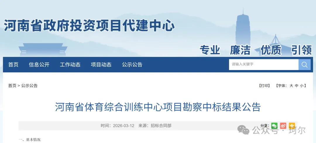 从河南省政府投资项目代建中心官网了解到,河南省体育综合训练中心项目勘察中标结果发布了。