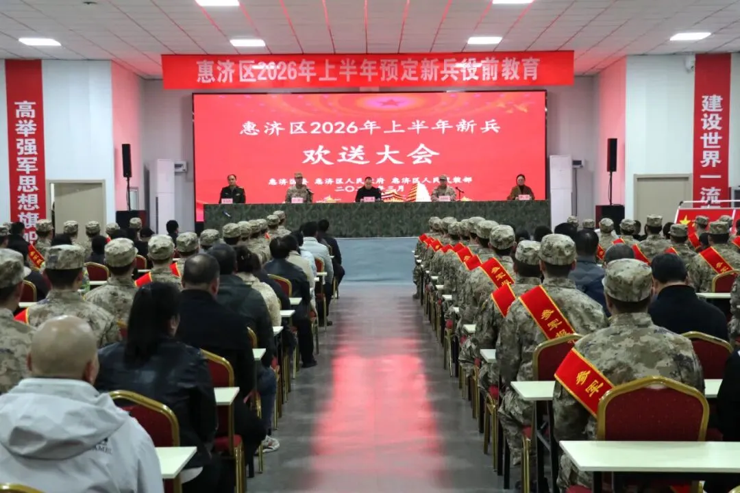 “我是中国人民解放军军人,我宣誓……”3月14日上午,河南省郑州市惠济区役前教育基地口号震天、军旗猎猎,75名新兵胸佩红花、肩披绶带,高举右拳,在欢送仪式上许下铮铮誓言。这也标志着惠济区2026年上半年征兵工作即将圆满收官,这批优秀青年将从这里出发,奔赴军营各个岗位。最高礼遇,见证“戎”光时刻。上午11时,欢送大会在嘹亮的国歌声中拉开帷幕。区人武部领导宣读入伍命令,每一声呼点,新兵们都以震耳欲聋的“到”声作答,字字千钧。随后,家属们亲手为新兵披挂“参军报国 无上光荣”绶带。这一刻,不仅是荣誉的加冕,更是责任的传递。“忠孝”基金,后方无忧助前方无惧。“你为国尽忠,我替你尽孝!”在欢送仪式上,一份特殊的保障——河南“忠孝”基金宣传卡,被郑重交到了新兵家属手中。“忠孝”基金不仅是一项拥军优属的善举,更是巩固军政军民团结的法宝。现场播放的《我在你身后》MV中,一句“你在前方射天狼,家里的事有我给你扛”,更是让现场许多家属湿了眼眶。赓续血脉,强军目标催人奋进。“你们赶上了改革强军的伟大时代,接过了建设世界一流军队的历史重任。”区人武部领导在寄语中勉励新兵把“满腔热血”化为练兵备战的实际行动。区政府领导也表示,区委、区政府将全力做好拥军优属工作,当好新兵的坚强后盾。热血出征,不负韶华不负亲。新兵代表王腾飞在发言中表示,到部队将继承先烈遗志,发扬“一不怕苦、二不怕死”的战斗精神,早日完成从一名地方青年到合格军人的转变。新兵家长代表何占峰则动情地说:孩子穿上军装,就是国家的栋梁,我们全家都支持他!仪式最后,全场响起《中国人民解放军军歌》,激昂的旋律点燃了每一位在场人员的热血。随着“战友们,准备好了吗?”的问声响起,75名新兵齐声怒吼:“听党指挥,能打胜仗,作风优良!”这不仅是一次欢送,更是一次出征前的铮铮誓师。据悉,在役前教育和封闭管理期间,区人武部坚持“未入军营,先铸军魂”,先后开展心理疏导、送法助征兵、常见训练伤防治等活动。一系列扎实有效的举措,不仅为新兵系好军旅生涯“第一粒扣子”,更为他们即将到来的军营生活打下坚实思想基础与体能基础。