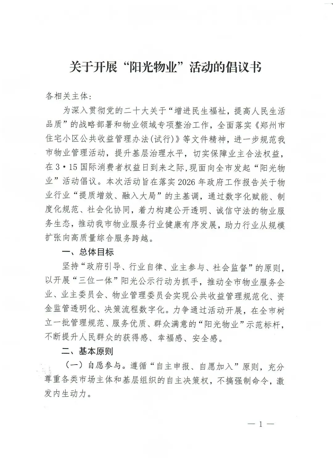 同时,活动遵循自愿参与、公开透明基本准则,依托郑州市智慧物业管理平台,实现小区公共收益、服务信息、履职情况实时公开、动态更新,主动接受政府监管、业主监督与社会评议。力争通过此次活动,在全市树立一批管理规范、服务优质、群众满意的“阳光物业”示范标杆。
