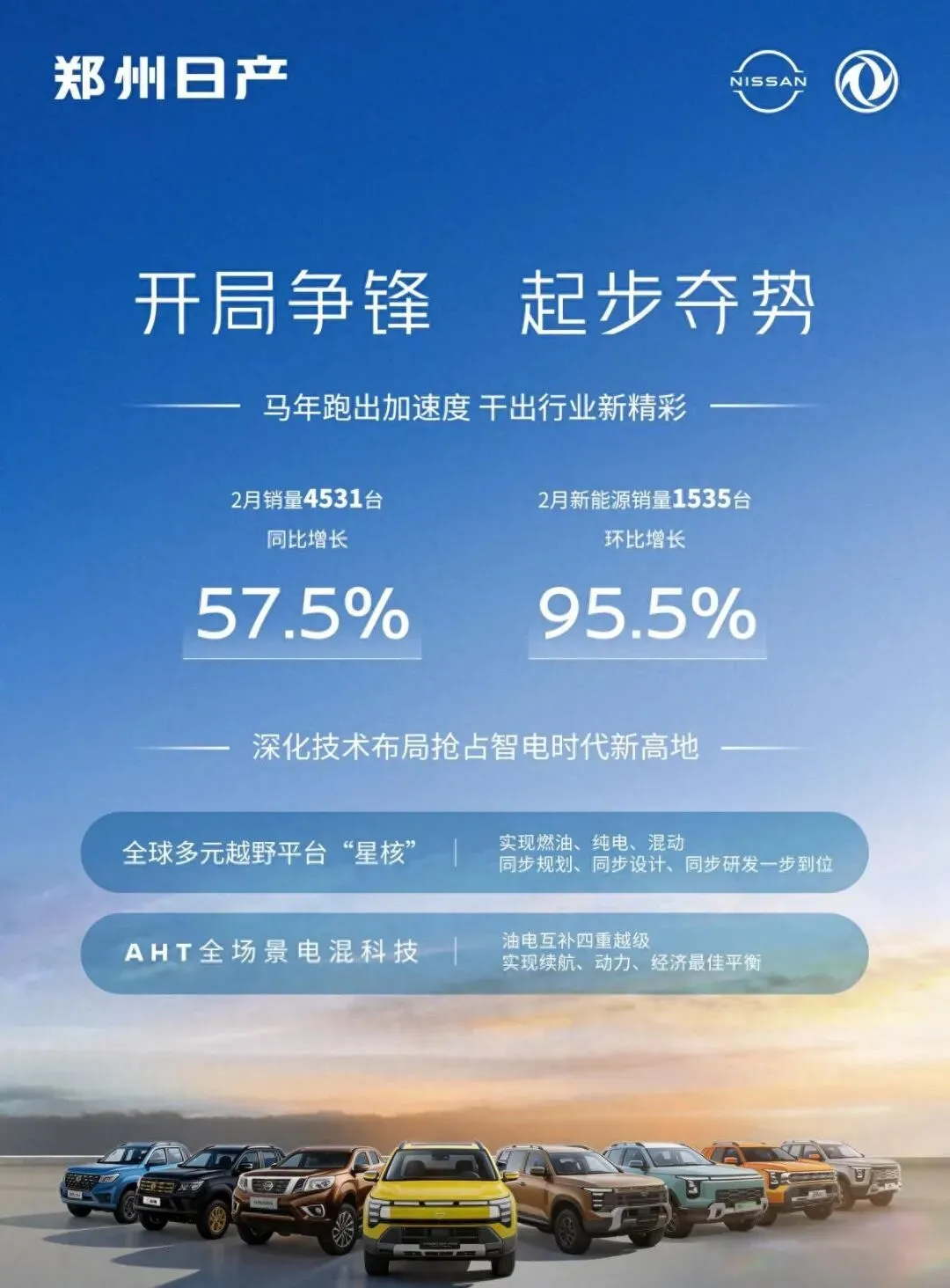 2026年头两个月,轻型货车卖得不好,整个行业跌了近8%。可郑州日产的销量数字跳得特别高,比去年同一时候多了快六成。最扎眼的是,它在新能源皮卡这块儿,2月占了全国四成一的份额,比第二名高出一大截。这不是临时抱佛脚,是真正在换骨头——油车没丢,混动车跑得快,纯电车马上也要上市。