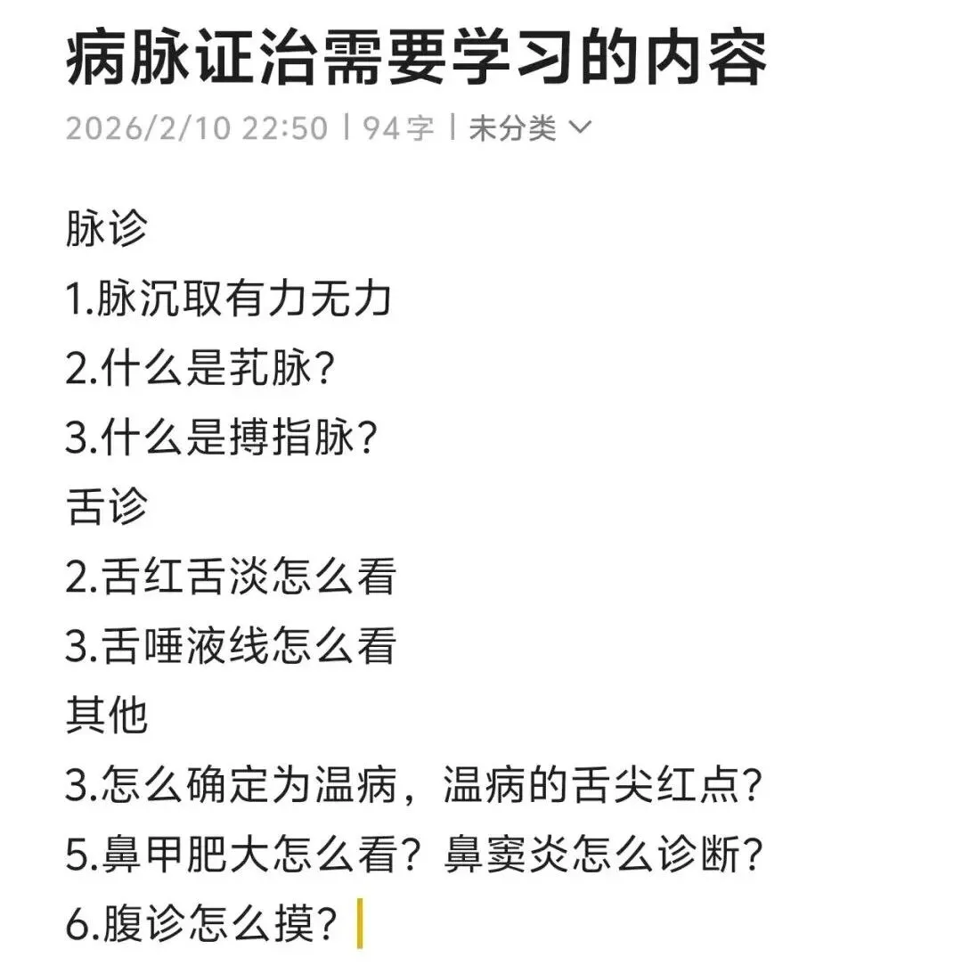 这次学习到的典型的脉象有,舌尖红,舌边淡,苔厚腻的三仁汤舌象,还有舌尖红的石膏证舌象,舌尖红点,苔厚腻的甘露消毒丹舌象,典型的用温胆汤的有唾液线的舌象,典型的淡白舌,典型的暗红舌。带着问题去学习,看到典型的舌象,把到典型的脉象,终身难忘。