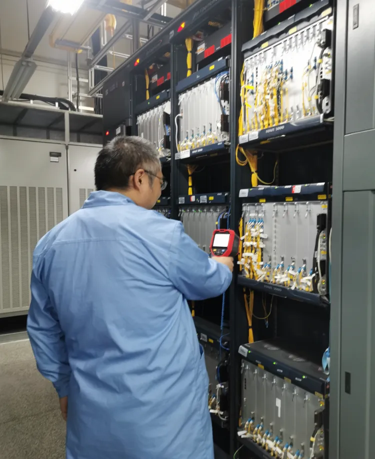 动态监测,精准掌控运行态势。秉持 “无死角、无盲区、全覆盖” 的监测原则,郑州联通长途传输维护团队在机房每列传输设备进出口科学布设温湿度计,依托温湿度计的实时显示功能,结合运维人员的定时巡检读数,动态、全面掌握机房温湿度变化情况,构建起 “早监测、早发现、早预警” 的温湿度防控体系,确保环境异常能够第一时间被察觉。同时,强化机房专用空调运行状态监测,严格遵循通信机房环境管理规范:机房内温度稳定保持在 18℃—27℃,相对湿度控制在 40%—60% RH。通过对机房环境的精准管控,不仅从源头有效规避高温引发的设备降频、板卡损坏等问题,同时防范湿度过高导致的凝露短路、湿度过低产生的静电板卡损坏等风险,为传输设备打造稳定、适宜、安全的运行环境。同时,建立快速响应与闭环处置机制,一旦监测到温湿度数据超出管控标准范围,立即启动环境调节机制,快速恢复机房云温湿度正常指标。针对各类温湿度异常情况,严格落实 “发现问题-及时上报-现场处置-复查达标”的全流程闭环管控,切实降低因环境因素引发的设备故障风险,保障传输设备持续稳定运行。