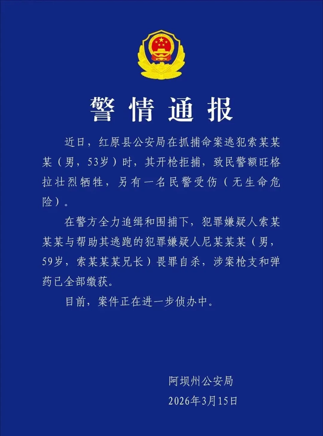 ⭐四川省阿坝州公安局3月15日发布警情通报称,近日,红原县公安局在抓捕命案逃犯索某某某(男,53岁)时,其开枪拒捕,致民警额旺格拉壮烈牺牲,2名嫌犯畏罪自杀。