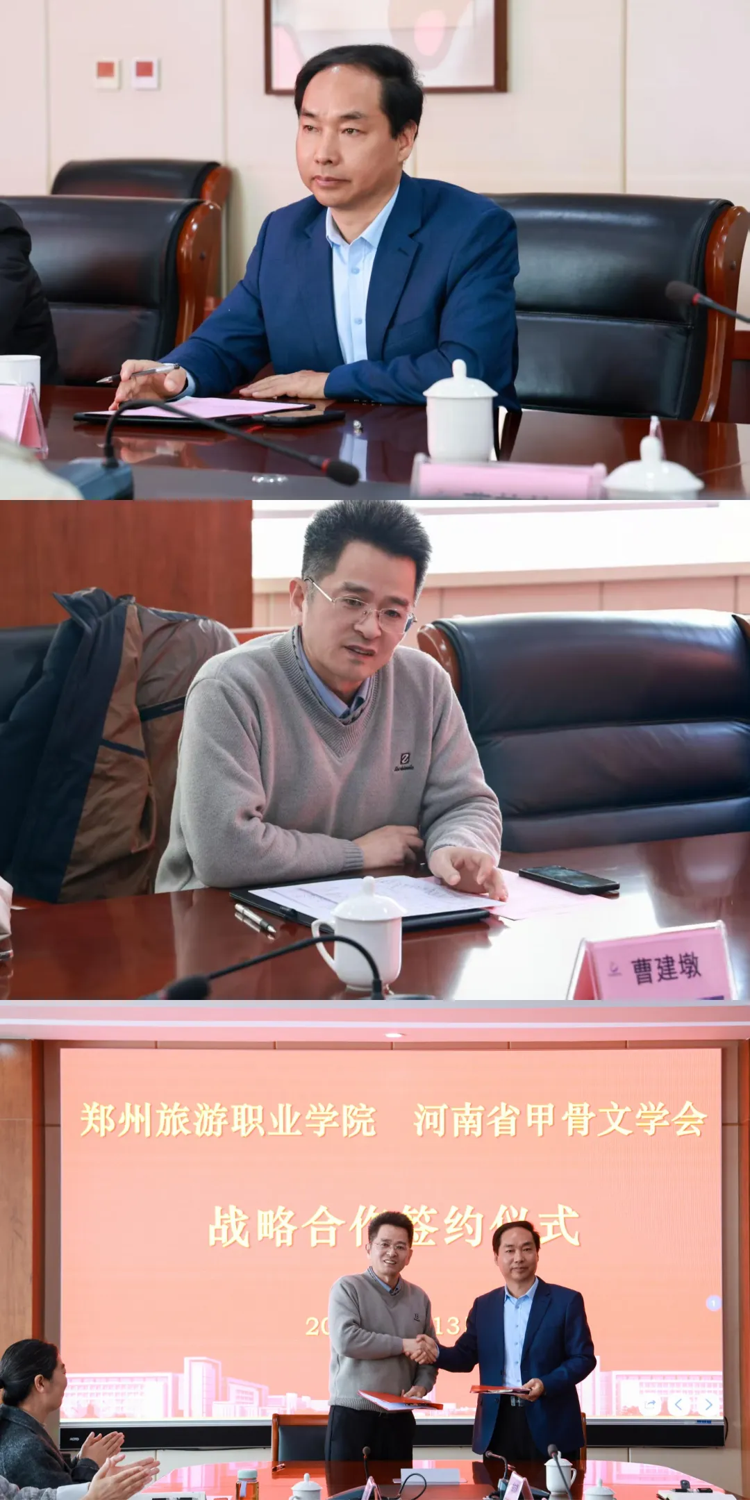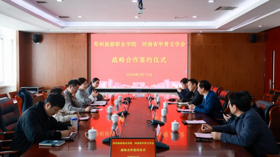 3月13日上午,郑州旅游职业学院与河南省甲骨文学会战略合作签约仪式在该校举行。校长肖世才、副校长张建军、合作发展处处长朱宇、数字文创学院院长韩志孝、图书馆馆长胡志霞,河南省甲骨文学会会长曹建墩、执行会长张红梅等双方相关负责同志出席签约仪式。