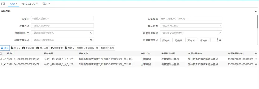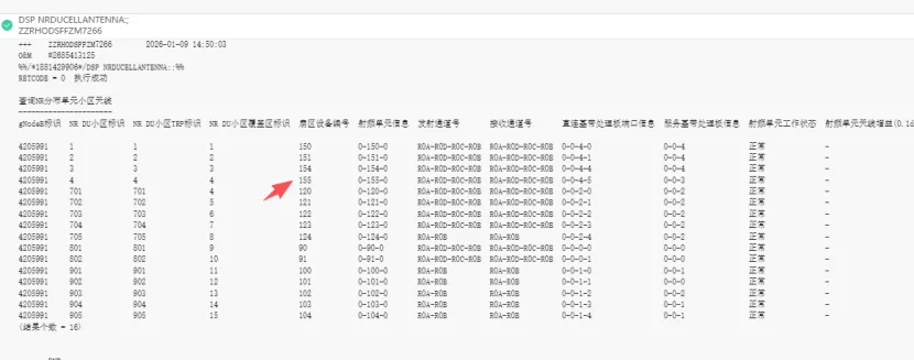 示例图5:网管数据显示无效AAU仍残留静态信息:查询网管数据,显示ZZRHODSFFZM7266目前只有155AAU绑定小区。