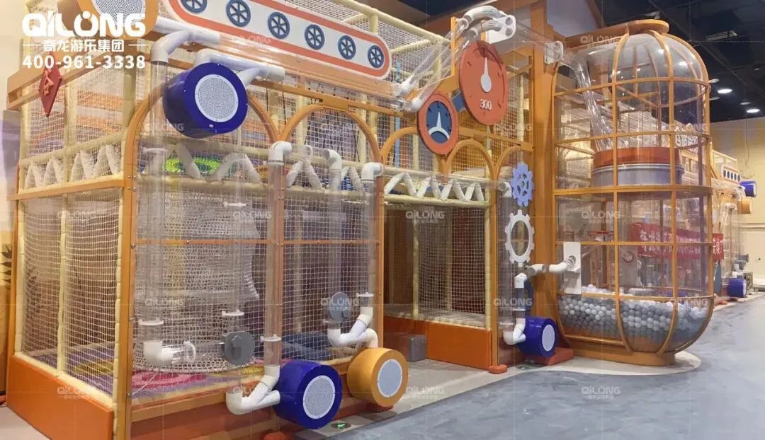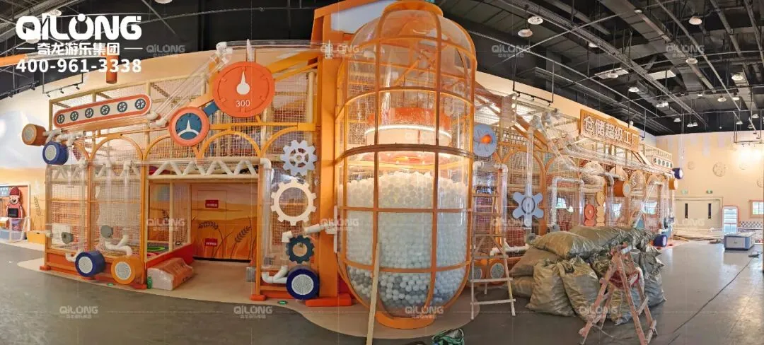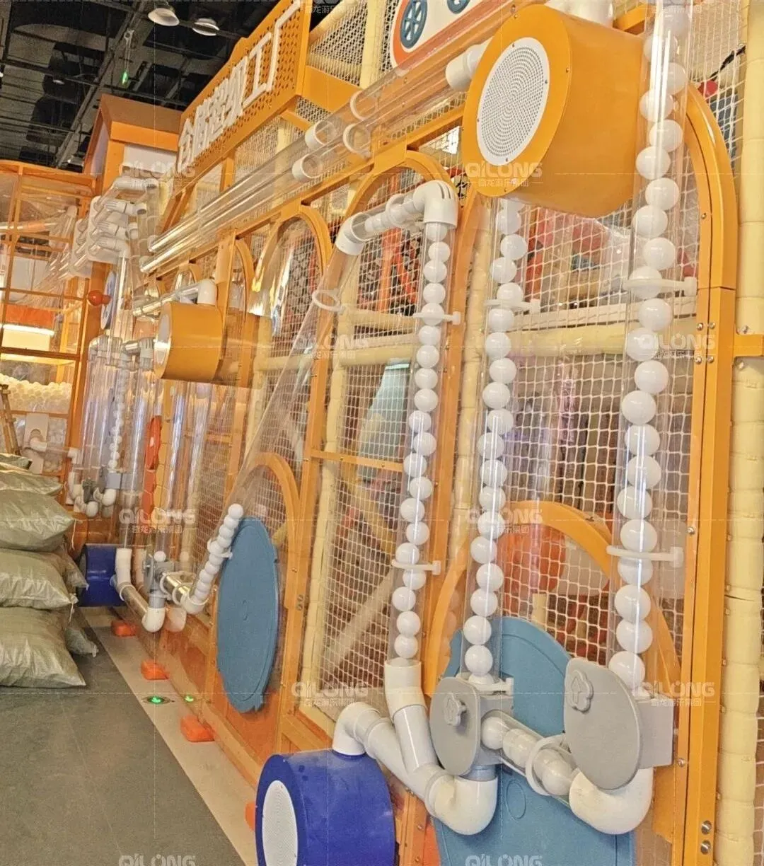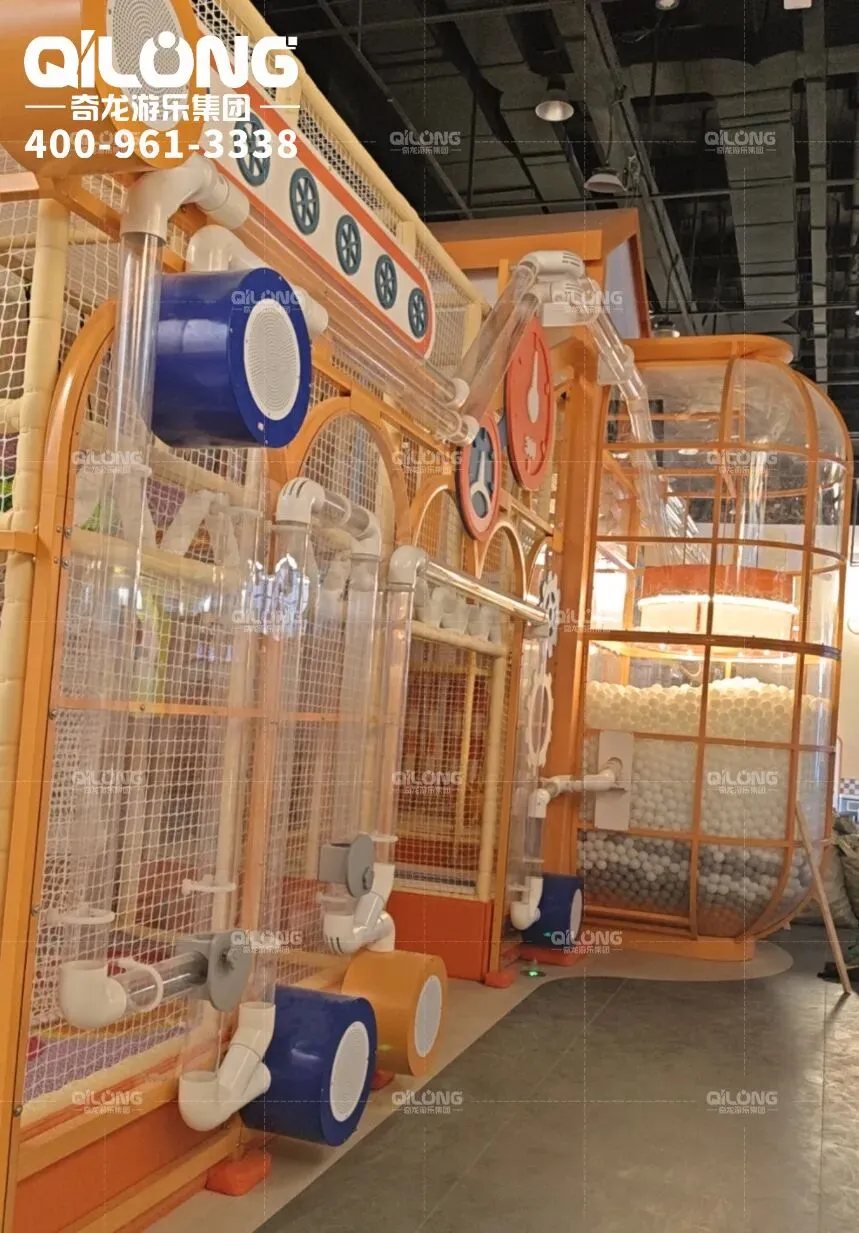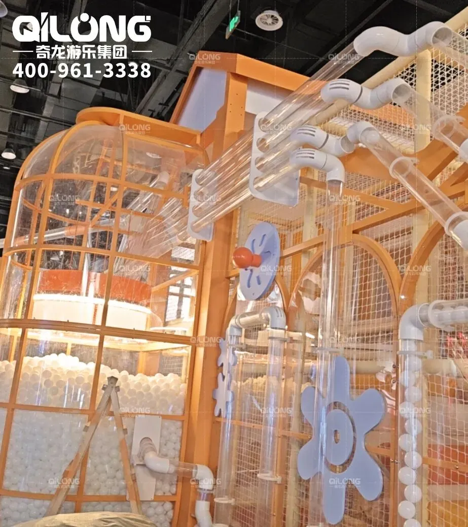 这里遍布各式古怪的装置,将海洋球任意传送,这里就像是由棉花糖构筑的蒸汽朋克世界~孩子们把小球放入通道入口,小球就会顺着蜿蜒盘旋的管道围着整个场地游走~