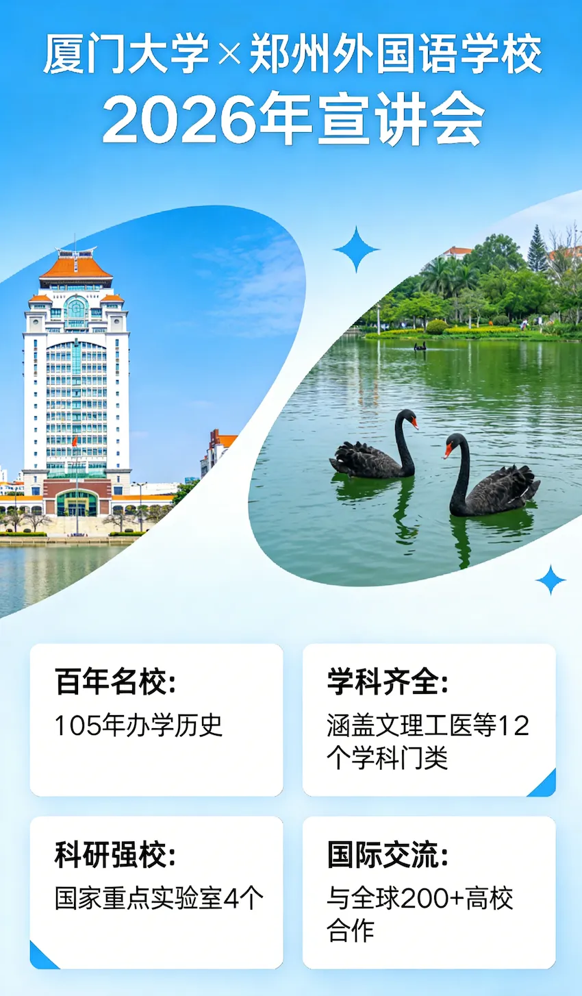 从鹭岛厦门到绿城郑州,从厦园红墙到郑外校园,跨越山海,只为赴一场母校之约,传一份青春薪火。这个寒假,厦门大学“情系郑外”实践队的队员们重返郑州外国语学校,以学长学姐的身份,为正奋战在求学路上的学弟学妹们分享厦大故事、传授备考经验、解答升学疑惑,让厦大的青春风采与郑外的拼搏精神交织碰撞,为追梦少年点亮前行的光。