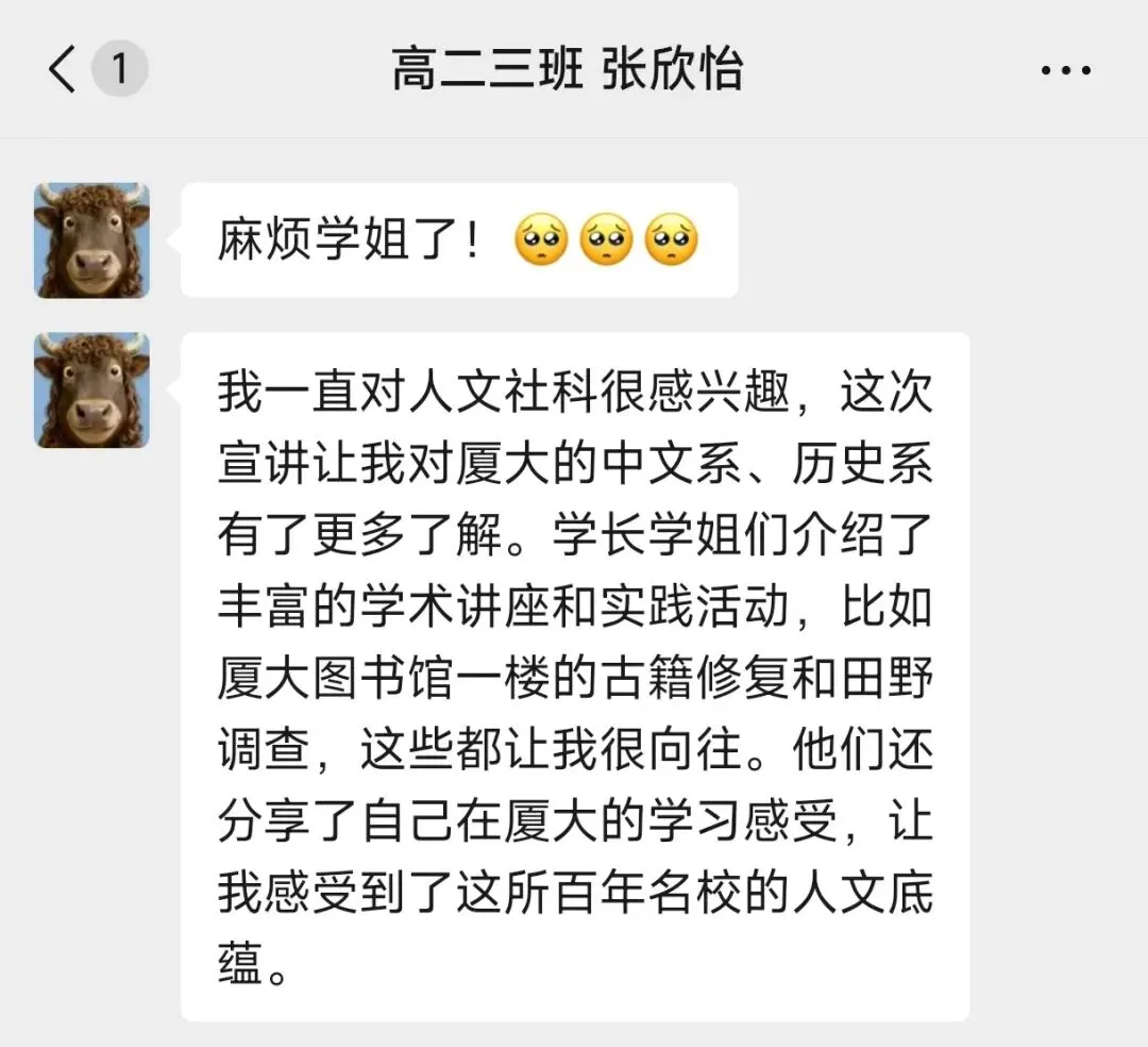 为提供长期帮助,实践队还搭建了厦门大学专属线上咨询群,邀请现场感兴趣的同学加入,并通过班主任转发扩大覆盖范围。群内安排专人值守,及时回复疑问、分享干货,成为连接郑外与厦大的暖心纽带。