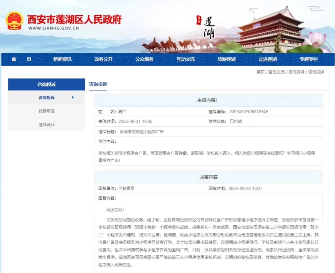 2025年8月31日,就有市民向西安市莲湖区人民政府投诉,反映学校使用的相关微信小程序存在广告弹窗问题,质疑学习类小程序投放广告的合理性,要求取消相关广告。同年9月3日西安市莲湖区教育局便给出了办结回复。