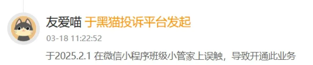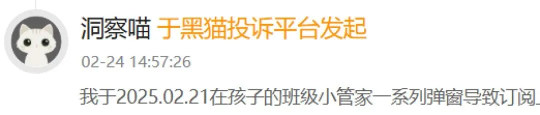 记者还注意到,在黑猫投诉平台上,类似投诉还有不少:有家长点开“班级小管家”查看孩子成绩,弹出输入手机号和验证码的图框,误以为是登录操作,尚未输完验证码就被开通15元/月的业务;还有家长因同样误触,被通讯运营商开通每月自动扣费服务。