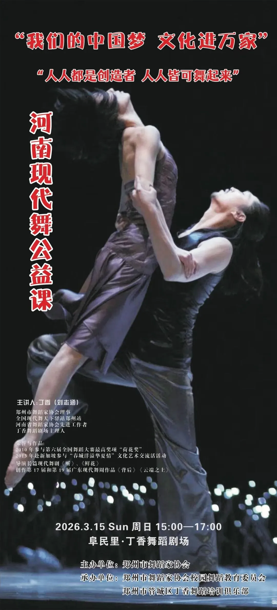 为推动现代舞艺术普及,激发大众对舞蹈的创作热情,3月15日,郑州市舞蹈家协会在郑州市管城区阜民里丁香舞蹈剧场成功举办“我们的中国梦 文化进万家”——“人人都是创造者 人人皆可舞起来”现代舞河南公益课活动,以艺术之力丰富基层群众精神文化生活。