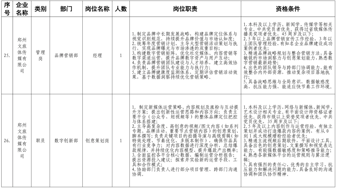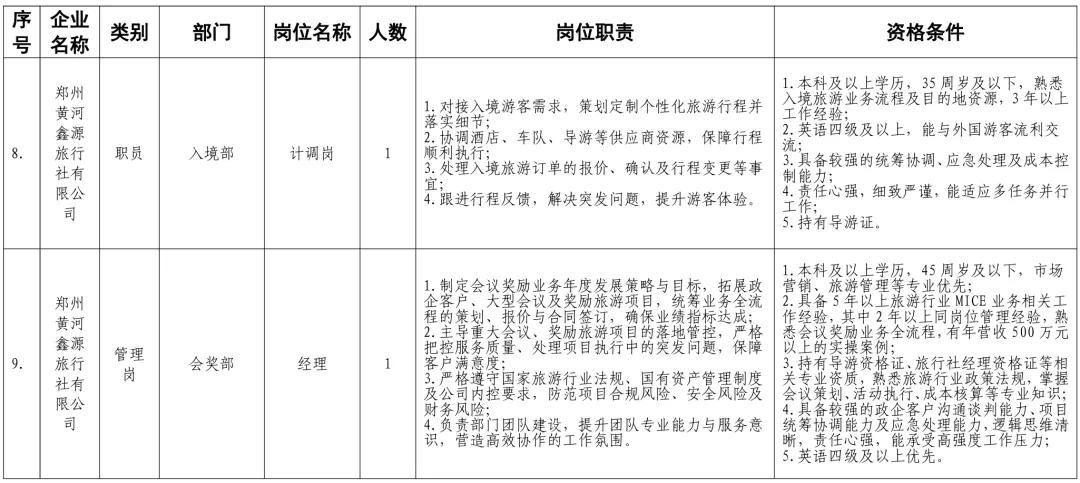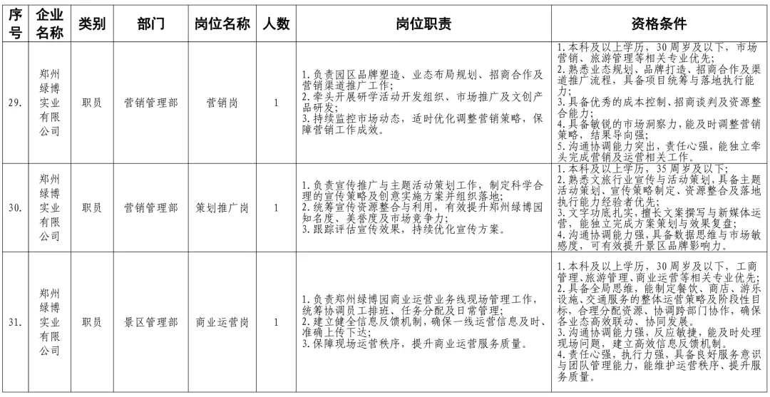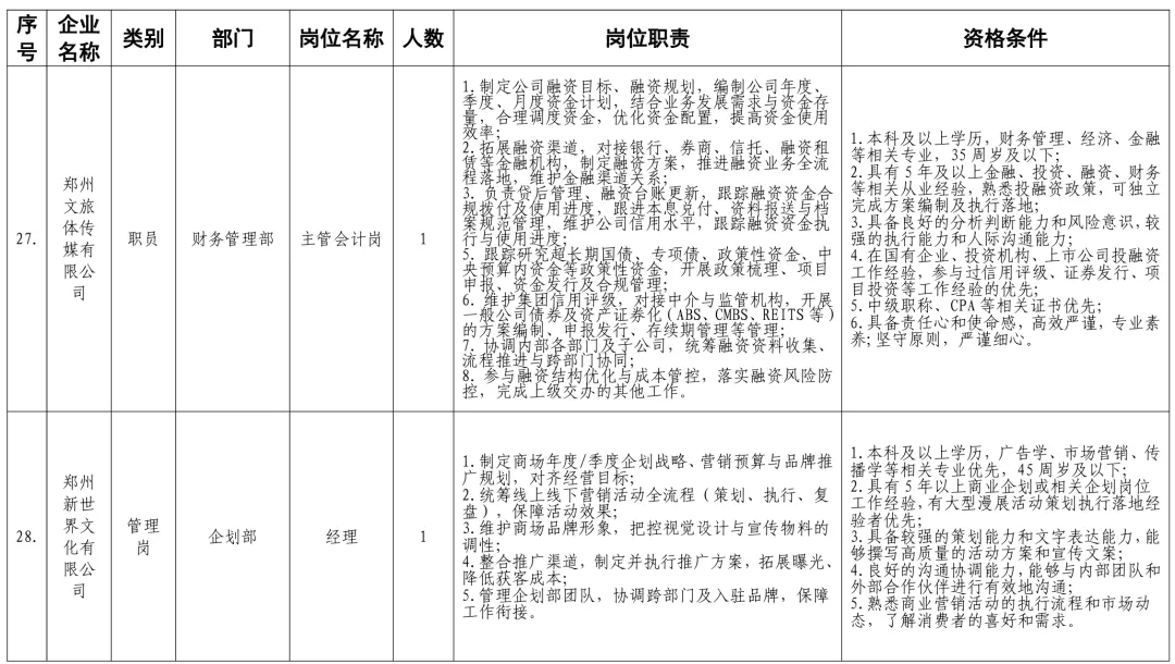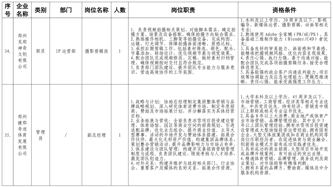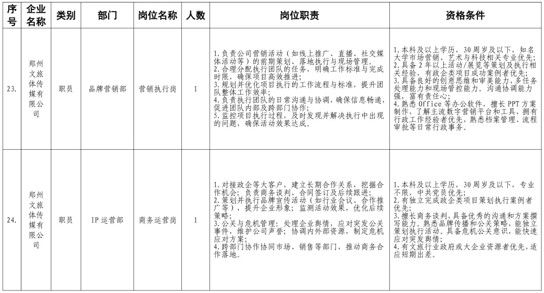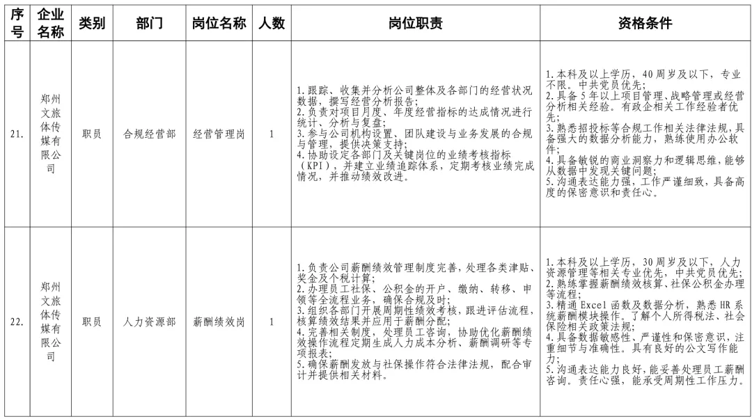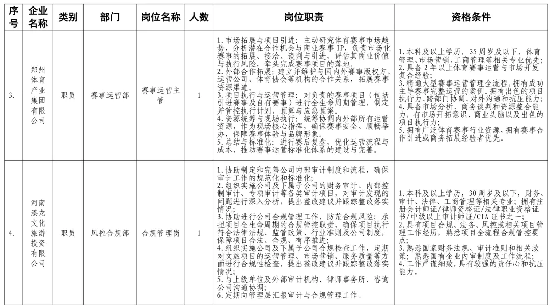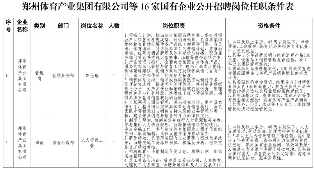 招聘岗位及有关要求见《郑州体育产业集团有限公司等16家国有企业公开招聘岗位任职条件表》。
