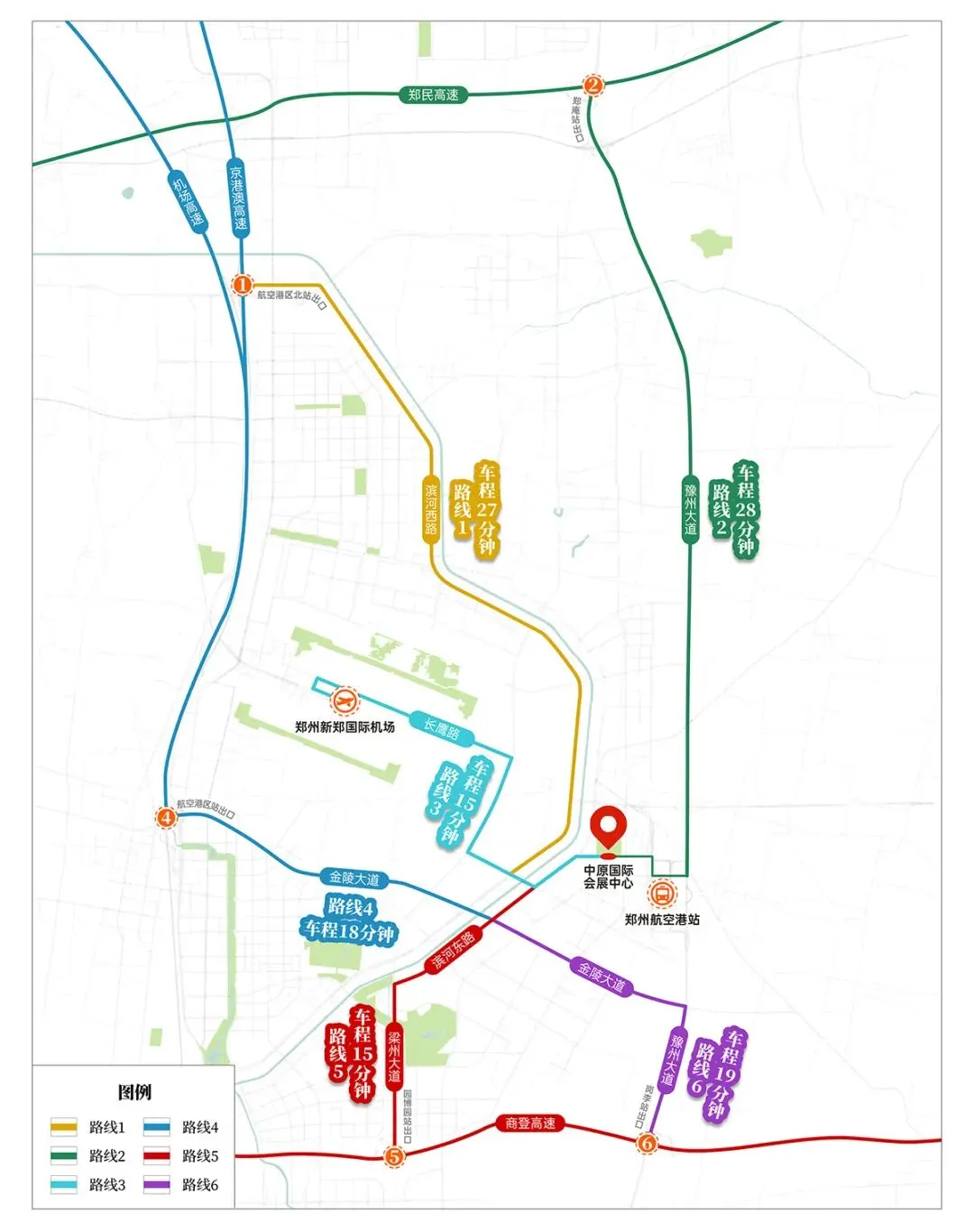 路线三:从S82郑民高速→郑庵收费站→豫州大道→皛店路→荆州路→中原国际会展中心P5--P6停车场路线四:从S60商登高速→园博园收费站→梁州大道→滨河东路→中原国际会展中心P1--P4停车场路线五:(经长鹰隧道一梁州大道)郑州市区出发一经S1机场高速/G4京港澳高速一机场收费站一迎宾大道一长鹰路一长鹰隧道(下穿机场T2航站楼)一长鹰路一梁州大道一毫都路一滨河东路一中原国际会展中心,全程约40分钟。路线六:(商登高速-梁州大道线)郑州市外西南地区出发一S60商登高速一园博园收费站一梁州大道一滨河东路一会展五路一中原国际会展中心