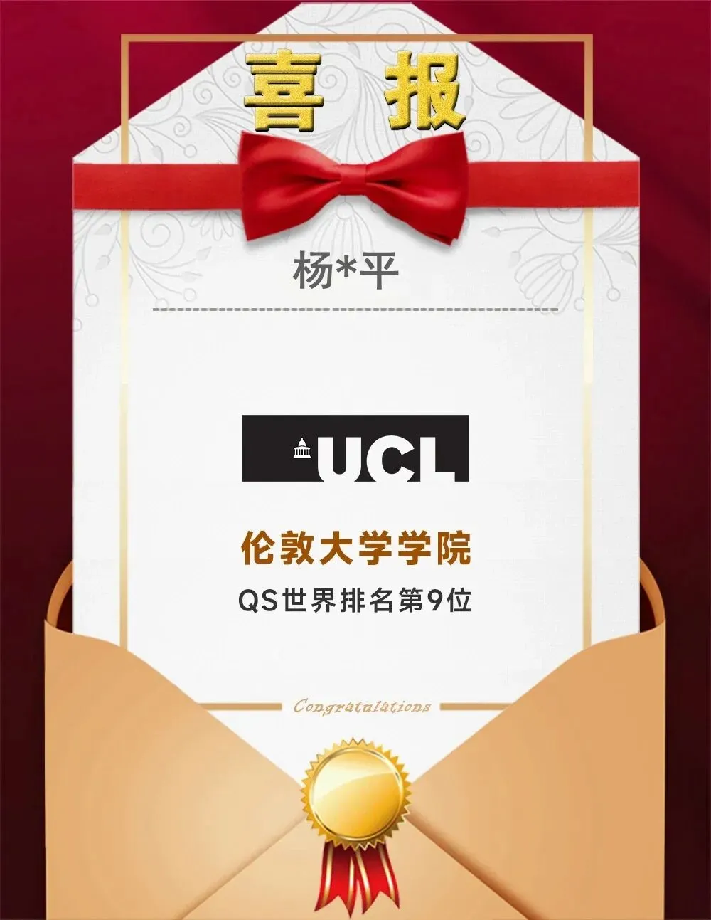 新学期伊始,郑州市第四十七高级中学中美项目高三剑桥A Level班喜讯连连——杨*平、孟*如两位同学凭借优异的学术成绩与综合素养,双双斩获英国G5超级精英大学 伦敦大学学院(UCL)化学工程专业录取通知书,为2026届海外录取再添浓墨重彩的一笔。