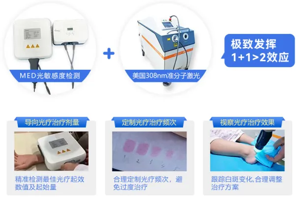 1. 308准分子激光治疗仪:精准将激光能量作用于白斑部位,刺激黑色素细胞生成,具有高效、安全、疗程短的优势,适用于各类白斑,尤其适合儿童、孕妇等特殊人群,是目前临床公认的高效治疗手段;