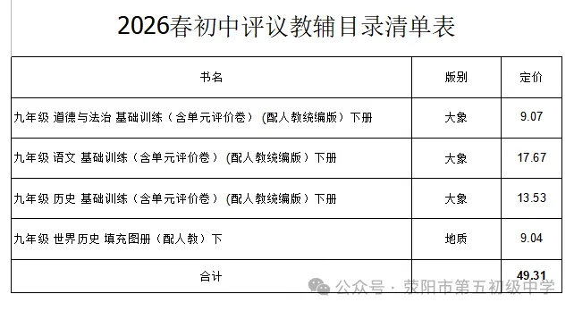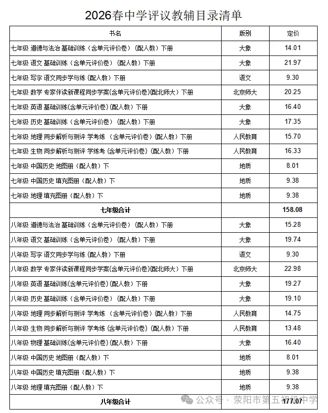 根据《中小学教辅材料管理办法》《河南省中小学教辅材料进校园管理“十严禁”》等相关规定,各学校需严格按照上级主管部门要求,从教育部门评议通过的教辅目录内选择教辅材料;需严格落实学生、家长自愿购买原则,坚决杜绝违规征订行为,严禁任何年级、班级和个人以任何形式强迫或变相强迫学生购买教辅材料;需严格落实“一科一辅”,切实减轻学生课业负担和家长经济负担。为规范开展我校2026年春季学期教辅征订工作,确保征订流程公开透明,现对学校七、八、九年级教辅材料目录予以公布。