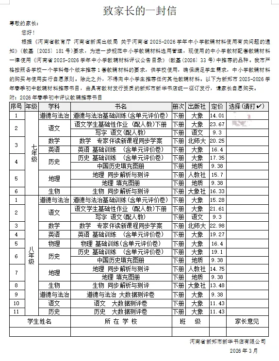 本次推荐选用的教辅书目,选自河南省2025-2026学年春季学期中小学教辅材料白名单目录。收费严格按照官方核定价格据实收取,学校无偿代购、不加价、不牟利。坚持家长自愿选购原则,不强制、不变相强制、不捆绑销售。