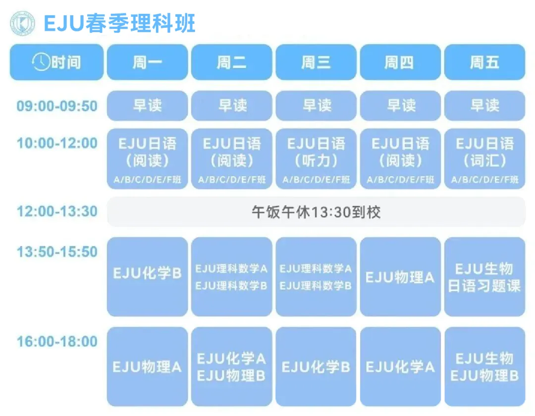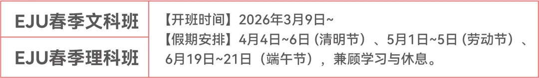 春季班包含2次EJU模拟考。平时也会结合往年EJU真题训练+考点解析,配合自习和答疑课程,帮助同学们有效消化、复盘真题训练带来的知识点应用,可以更平滑过渡适应赴日后的考学实践。