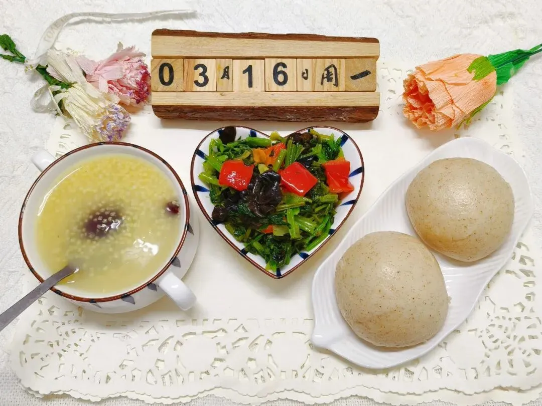 香芹炒木耳、高粱馒头、小米红枣粥