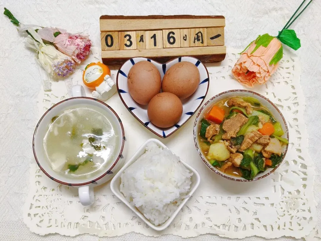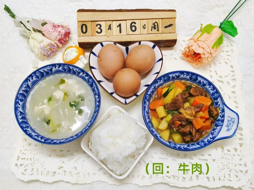 时蔬卤肉饭(回:牛肉)、五香卤蛋、冬瓜虾皮汤