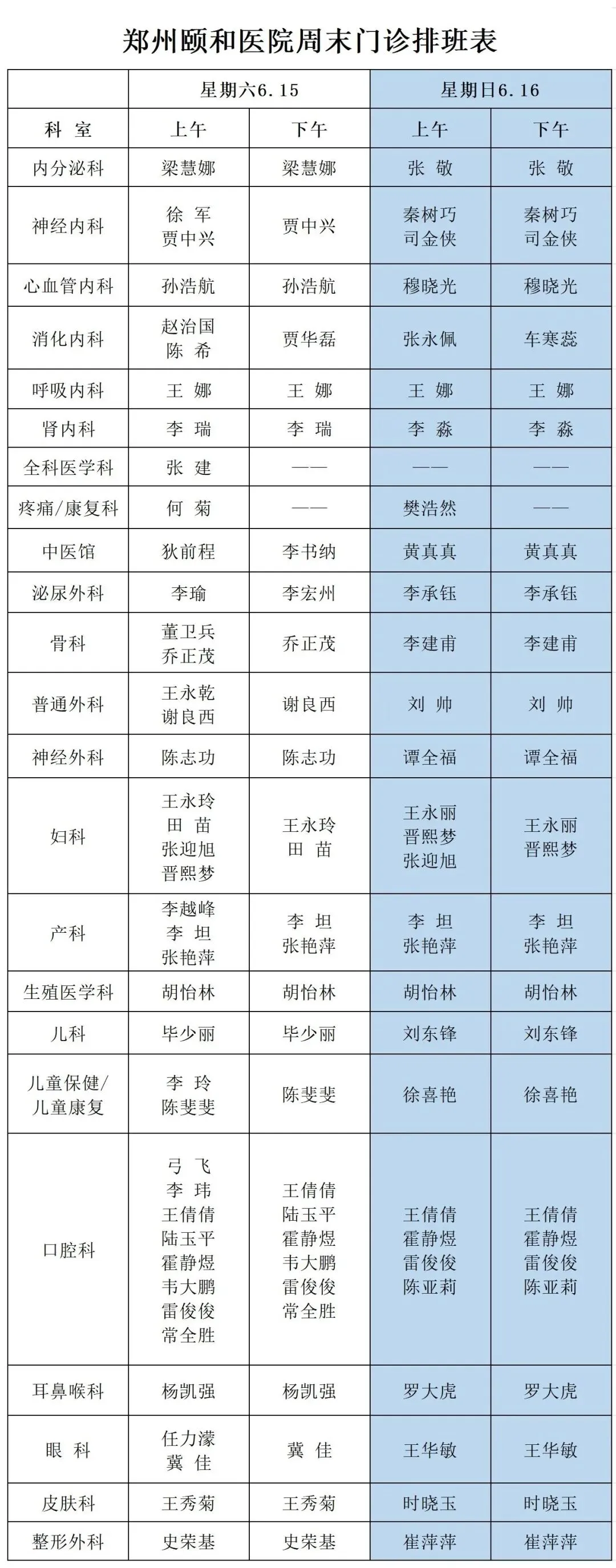 周末门诊排班表