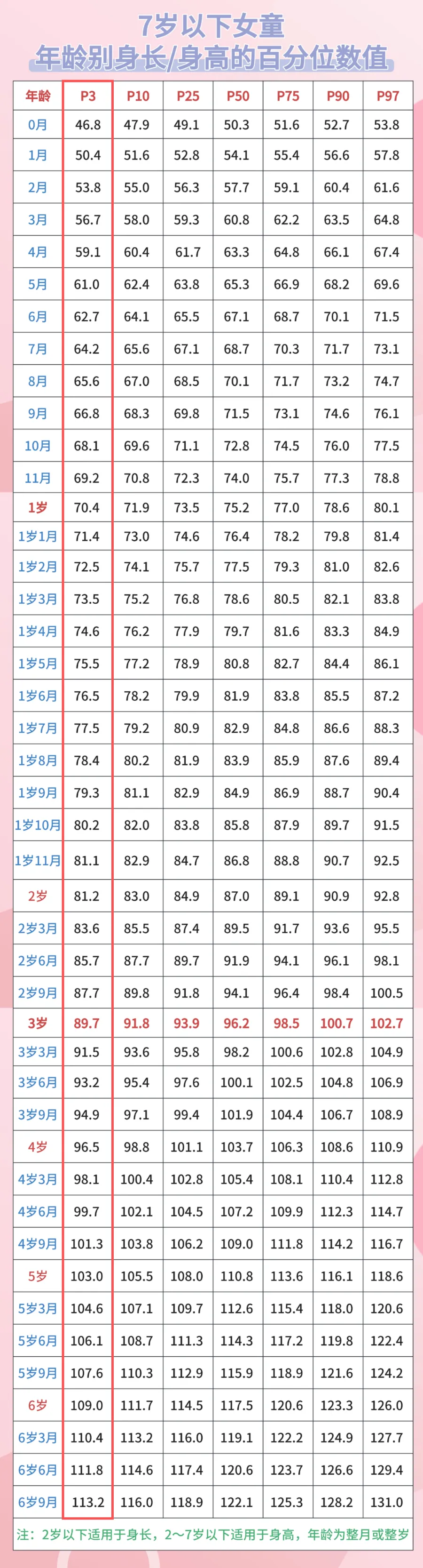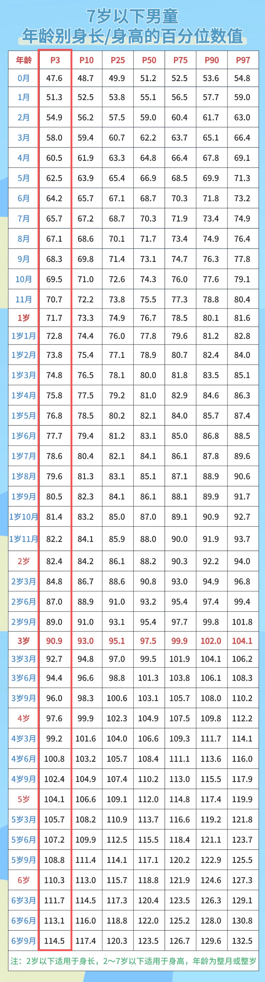 🔸7 岁以下儿童:对比身高百分位数值(7岁以上孩子跳过此表向后):△数据来源:国家卫生健康委员会《7岁以下儿童生长标准》第三步,向上看,找到对应的百分位(P3、P10、P50、P90 等)- P50:同年龄、同性别的平均身高