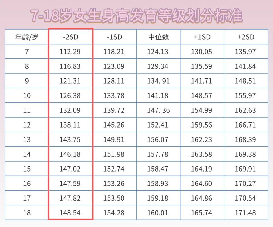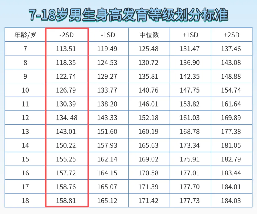 如果孩子身高长期在P3及以下,属于矮小范围,一定要及时到儿童生长发育门诊检查,不要盲目等 “晚长”!△数据来源:国家卫生健康委员会《7岁-18岁儿童青少年身高发育等级评价》如果身高≤-2SD,说明比同龄同性别的孩子矮了两个标准差,达到矮小诊断标准,请尽快就医排查原因,科学干预。