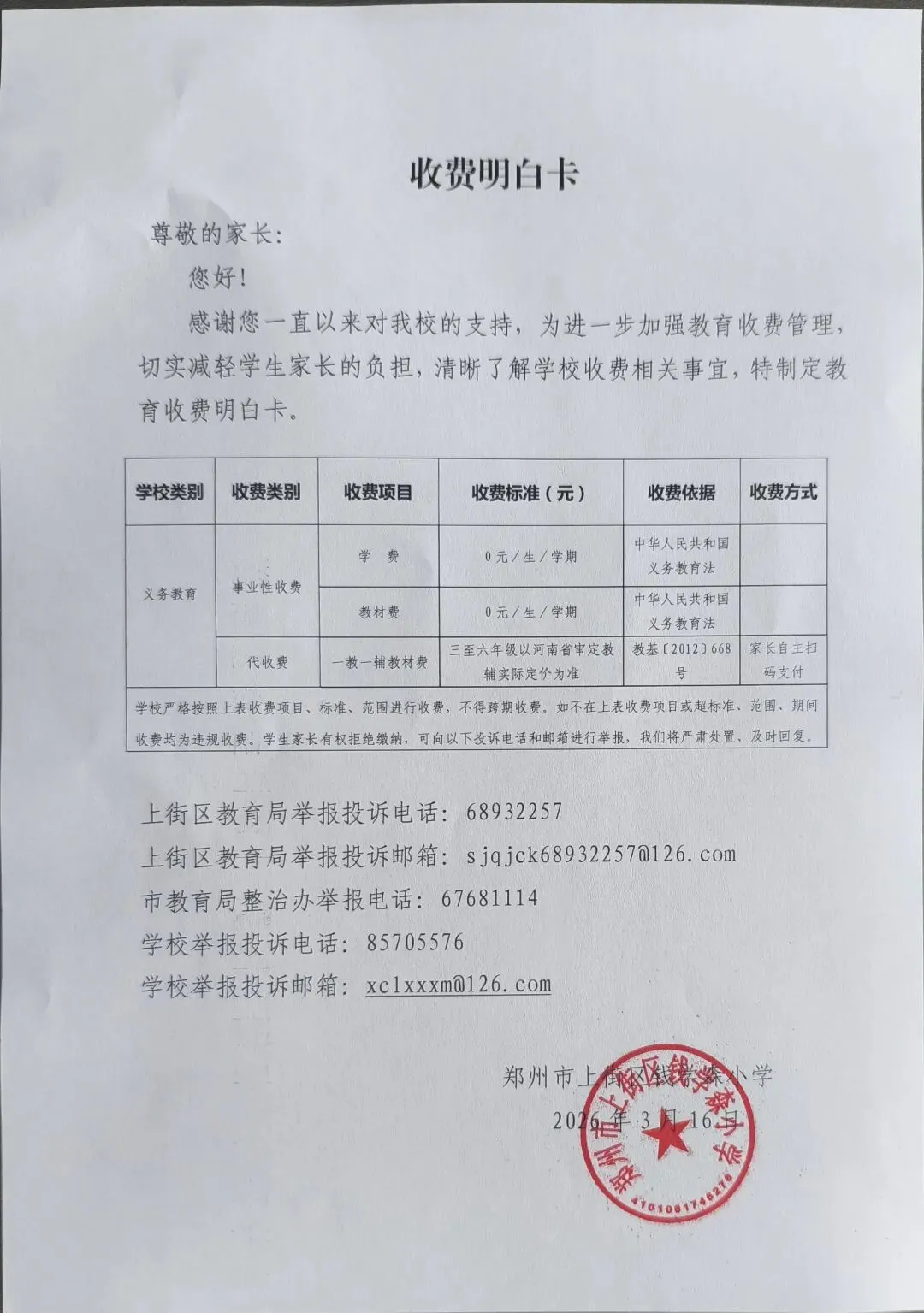 郑州市上街区钱学森小学收费明白卡