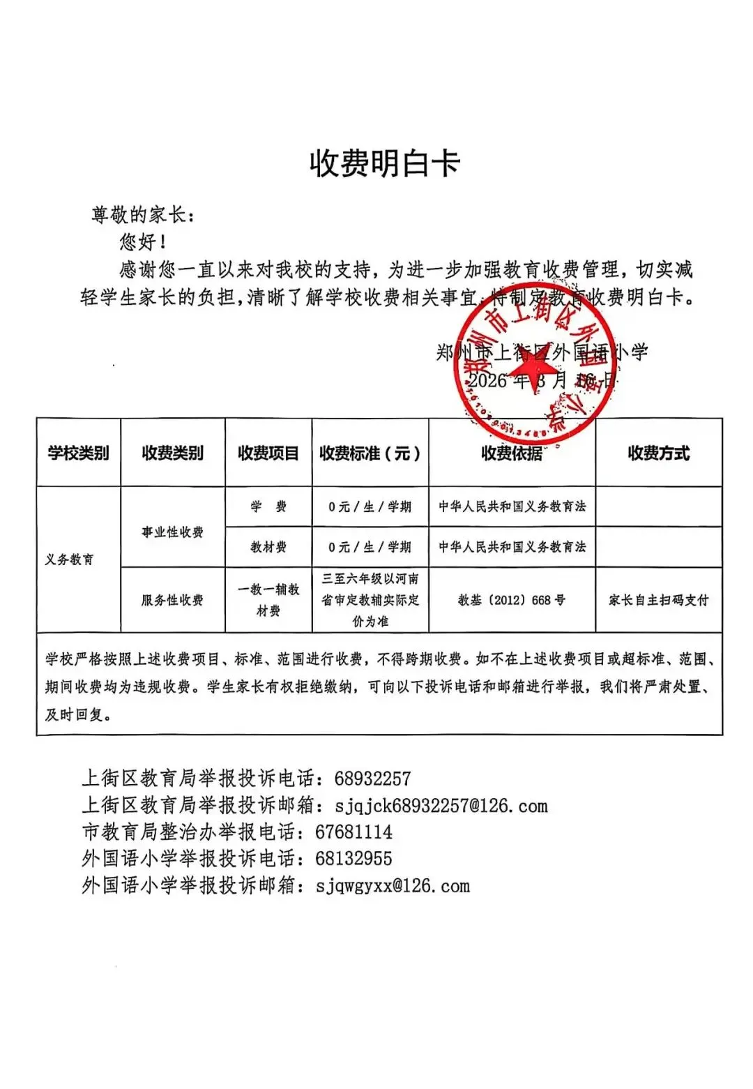 郑州市上街区外国语小学收费明白卡