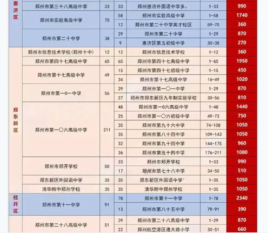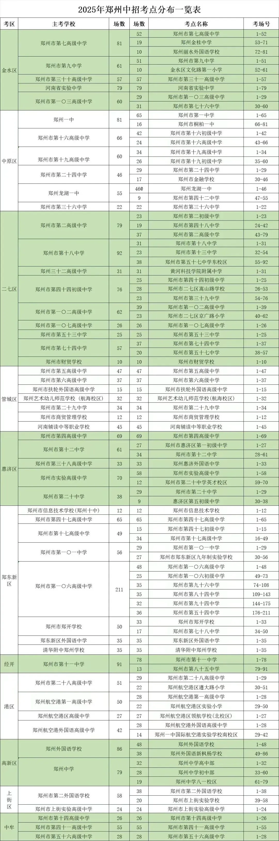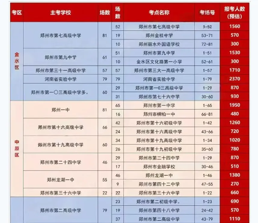 一志愿报考郑州龙湖一中的考生:考点安排在郑州龙湖一中和郑州第42中学。一志愿报考郑州市第七十四中学的考生,考点安排在郑州市第七十四中学和郑州市第五十七中(总校),共计57个考场。一志愿报考郑州市实验高级中学的考生,考点安排在郑州市实验高级中学和郑州市第二十中学英才校区,共计69个考场。一志愿报考郑州市第七高级中学的考生,考点安排在郑州市第七高级中学,郑州金桂中学、郑州丽水外国语学校,共计81个考场。一志愿报考郑州市第九中学的考生,考点安排在郑州市第九中学和文化路一小。一志愿报考郑州市第十一中学的考试,考点安排在郑州市第十一中学和郑州市第85中学。一志愿报考郑州市第一中学的考生,考点安排在郑州市第一中学和郑州市桐柏一中,前65个考场安排在一中本部。一志愿报考郑州市郑开学校的考生,考点安排在郑州市郑开学校和第郑州市第78中学考点(宏昌街1号),总计50个考场。一志愿报考郑州市第103高级中学的考生,考点安排在郑州市第103高级中学和郑州市第七十六中学。一志愿报考郑州市第十九高级中学的考生:考点安排在郑州市第十九高级中学和郑州市第十九初级中学。一志愿报考郑州市第四高级中学的考生:考点安排在郑州市第四高级中学。一志愿报考郑州市第五高级中学的考生:考点安排在郑州市第五高级中学,预计总计47个考场左右。一志愿报考郑州航空港第一高级中学的考生,考点安排在郑州航空港第一高级中学和郑州航空港区实验小学北校区。一志愿报考郑州市第二高级中学的考生,考点安排在郑州市第二高级中学政通校区和郑州市第二初级中学。一志愿报考郑州航空港外国语高级中学,考点安排在郑州航空港外国语高级中学,郑州一中国际航空港实验学校南校区。一志愿报考郑州市第十六高级中学的考生,考点安排在郑州市第十六高级中学和郑州市第十六初级中学。一志愿报考郑州市第十七高级中学的考生,考点安排在郑州市第十七高级中学,第二考点暂未获得信息。一志愿报考郑州市第十四高级中学的考生,考点安排在郑州市第十四高级中学各校报考人数预估
