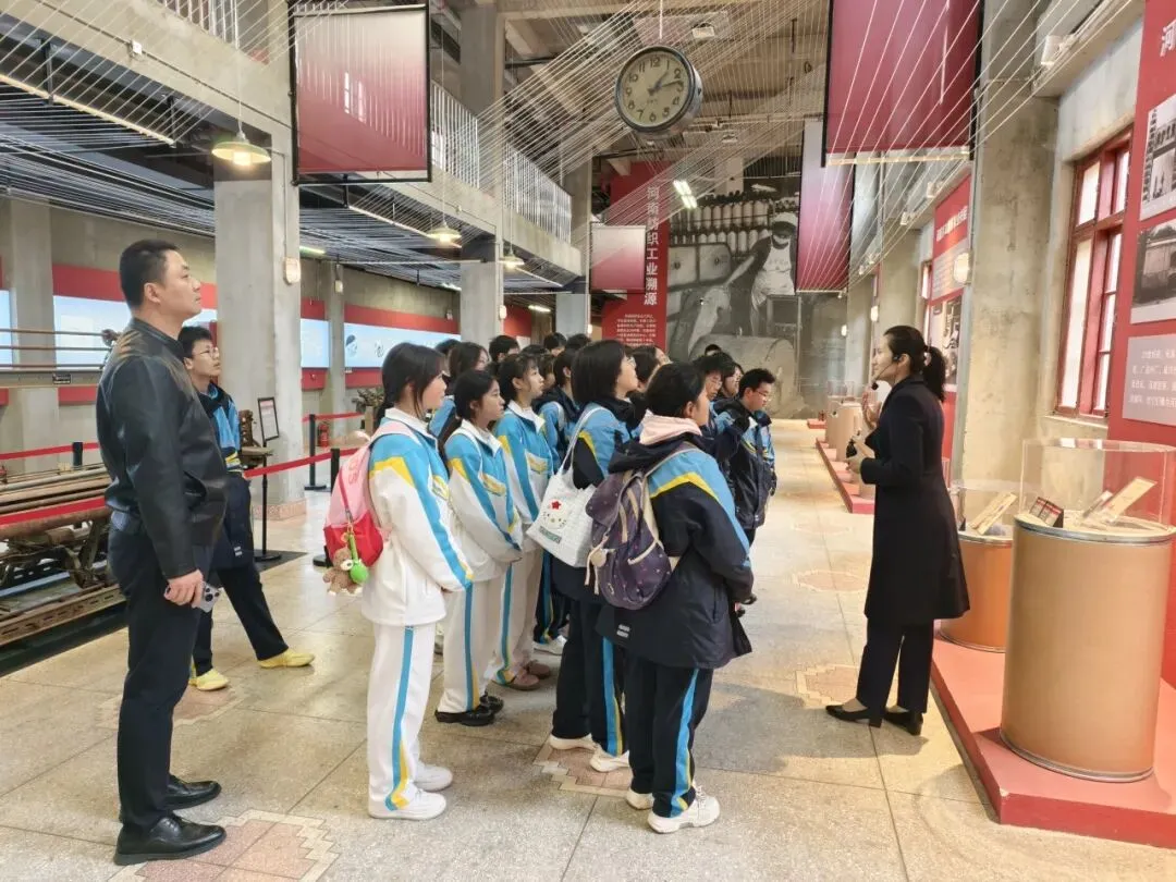 首站,师生们走进郑州市纺织工业遗址博物馆。作为依托国棉三厂旧址建设的河南首座工业遗产博物馆,这里见证了郑州“中原纺织城”的辉煌岁月。老旧纺织设备、历史照片与珍贵实物,生动再现了“一五计划”时期郑州纺织工业的发展历程。同学们认真聆听讲解,近距离感受老一代纺织人艰苦奋斗、爱岗敬业的精神风貌。在互动体验区,大家亲手操作纺织机具,体会从棉花到布匹的生产过程,进一步树立了尊重劳动、珍惜劳动成果的优良品质。