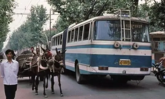 1980年代的郑州伏牛道路上,一辆拉着货品的驴车和一辆公交车电车并列行驶在马路上。