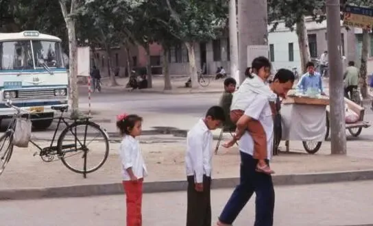 1980年代,郑州伏牛路、颖河路交界处的城市街景。一个父亲身背自身已经又哭又闹的女儿,而他的后面还跟着低下头像做错了事的孩子和另一个很迷惘的闺女。