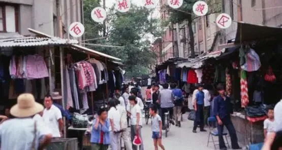 1980年代的郑州市区,二七区百货商店摊点摆放区,道路两侧有许多服饰摊点,来逛商场的群众还许多。