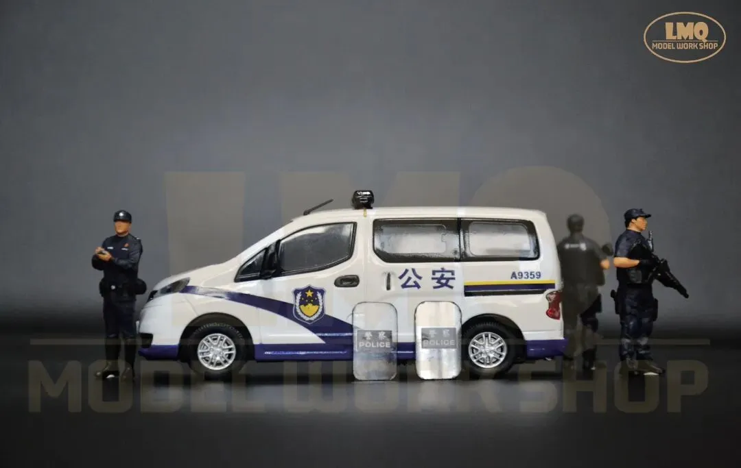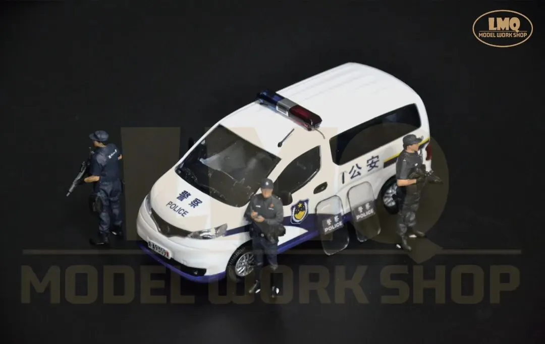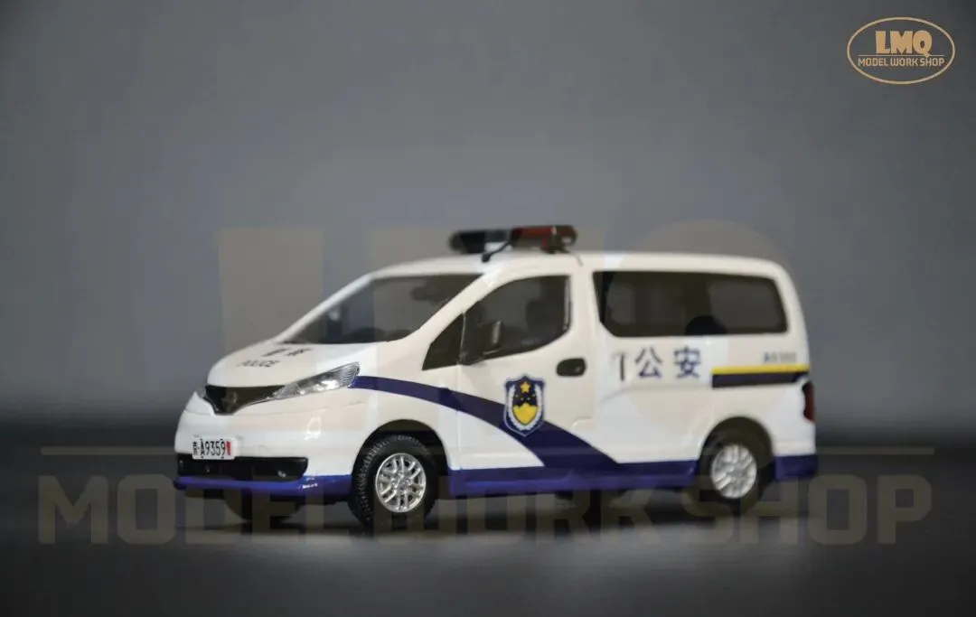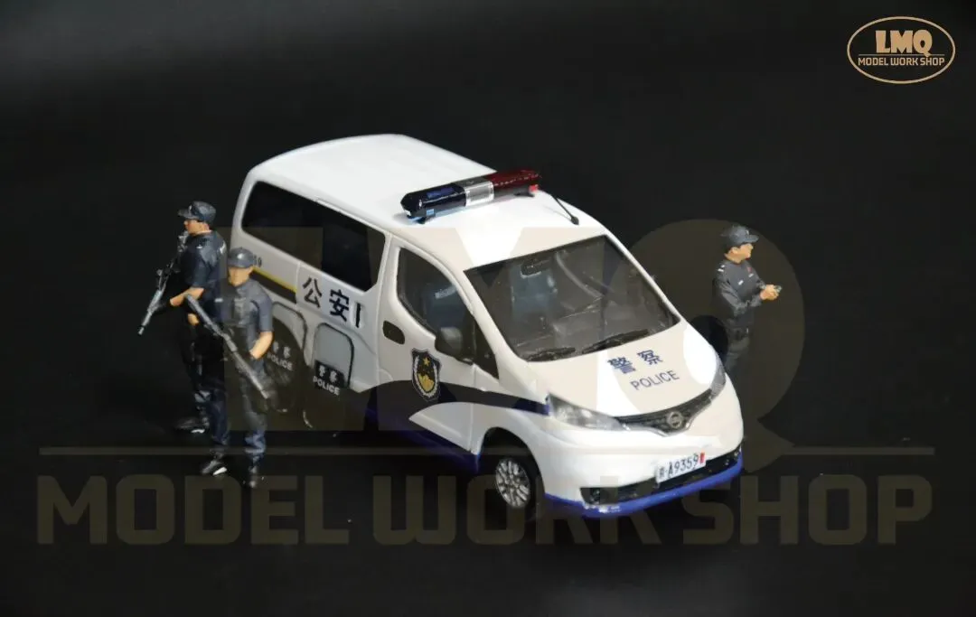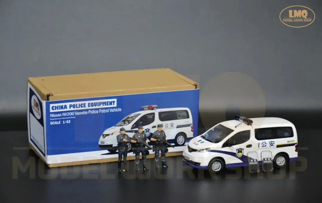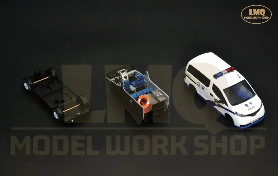 面对这一局面,北京警方决定通过组建专职化武装巡逻力量,将警力固化在街头,从而起到立足反恐防恐、提升快速反应、优化防控模式等作用。因此来增加民众安全感,全力维护首都社会的安全稳定。同年5月,由150台巡逻车辆组成的专职化武装巡逻队伍开始在首都的城市街面运行,这标志着北京警方专职化武装巡逻工作正式启动。组建专职化武装巡逻队伍,实施武装巡逻、巡中备勤的常态化机制,是当时北京警方为进一步增强街面防控的震慑性、针对性和预见性,对恐怖暴力犯罪开展快速有效的打击,以及最大限度挤压违法犯罪活动空间的重要举措。据了解,这样的巡逻车一天24小时不间断巡逻,并按照规定的行驶路线、停靠点、停靠时间及频率开展巡逻。停靠点则主要选择在路口、人员密集区域及重点区域的明显部位。与此同时,执勤民警会在距离巡逻车辆一公里范围内进行治安盘查。在人员配置方面,每辆巡逻车组由5名民警、4名辅警组成,平均每班次配备两名民警和一名辅警,分别携带长枪和左轮手枪。值得一提的是,他们不再担负一般性质的治安扰序,而是长期驻守城市街头,主要承担辖区内的武装巡逻震慑、涉枪涉爆、聚众持械斗殴、群体性暴力事件、暴力恐怖事件等警情的先期处置。当时的北京市公安局各派出所在分析所在辖区治安形势、发案情况等警方大数据的基础上,按照重点街面全覆盖,单车巡段不超过3公里,遇突发事件接警巡逻车组到场不超过3分钟的原则,对专职化武装巡逻车组进行布局,实现武装巡控全天候、全时空、全方位和全覆盖,并直接接受市局、分局两级勤务部门的指挥调动。近年来,我们在北京城市街头所能见到的巡逻车辆呈现种类多,实用性强等特点。像郑州日产NV200这样基于B级轿车平台的轻型厢型车(CDV,CarDerivedVan)本身具备商乘兼用的优良属性,在当今社会倡导绿色环保的趋势下,节能减排、空间大、多功能就成了“NV200”的显著优势。在执行专职化武装巡逻任务中的“NV200”,车上不仅配备民警使用的防爆枪支,同时配备防爆警棍、防爆盾、防弹背心、灭火器和其他救援设备,这也是一部巡逻车辆的标准配备。郑州日产NV200巡逻警车作为一款装备在基层派出所的常备车辆,其涂装与普通警车相仿。因此在制作中,我们主要对原模型漆色和内饰进行修改。除了模型外观,LMQ Model Workshop在内饰上下了不少功夫。新的内饰尾排由原先的座椅被修改为置物空间,并通过手工制作的独立配件来还原巡逻车组的实际配置。在模型内饰的处理中,座椅均参考实际车辆重涂为藏蓝色,靠背上贴有“警POLICE察”标识水纸。其次,为更好的搭配这款车模的主题和突出“专职化防控”的概念,除了配件装饰外,LMQ Model Workshop首次设计和应用人偶与汽车模型相匹配。同样为1/43的比例,人偶的加入可以使这款模型更加场景化,且具有可玩性和故事性。无论是盘查核录,还是应对突发事件,首都公安都以专职化武装巡逻为契机,持续深化防恐处突和应急机制,全面提升社会面整体防控效能,人民群众的安全感也在不断增强。直到今天,我们仍然可以见到不少以郑州日产NV200、现代途胜为代表的巡逻车在基层派出所服役。为了进一步响应国家节能减排的号召,北京警方在现有车辆的基础上增加了一定比例的新能源车辆,新车型的加入也为首都城市治安和城市可持续发展贡献更多的新质力量。该模型于2026年1月完成,并归纳到“中国公安车辆装备”的收藏序列中。模型性能:车轮可转动、独立配件可取下摆放、静态展示1. 《记者体验专职化武装巡逻车街面巡逻2014年7月5日 来源:央视网https://news.cctv.com/2014/07/05/VIDE1404524762954874.shtml2. 《北京首批专职化武装巡逻车驻守街头 巡警持枪执勤》2014年5月13日 来源:中新网 https://www.chinanews.com.cn/tp/hd2011/2014/05-13/346763.shtml
