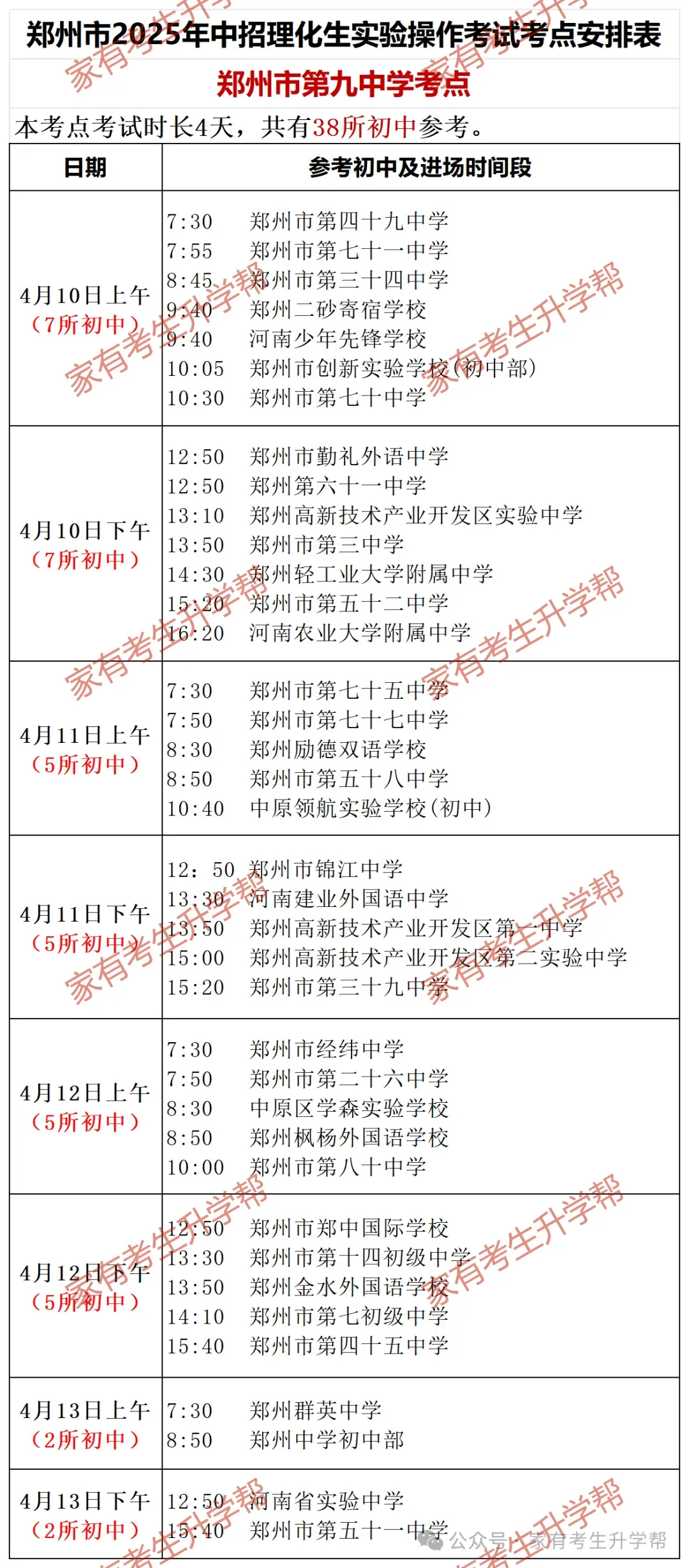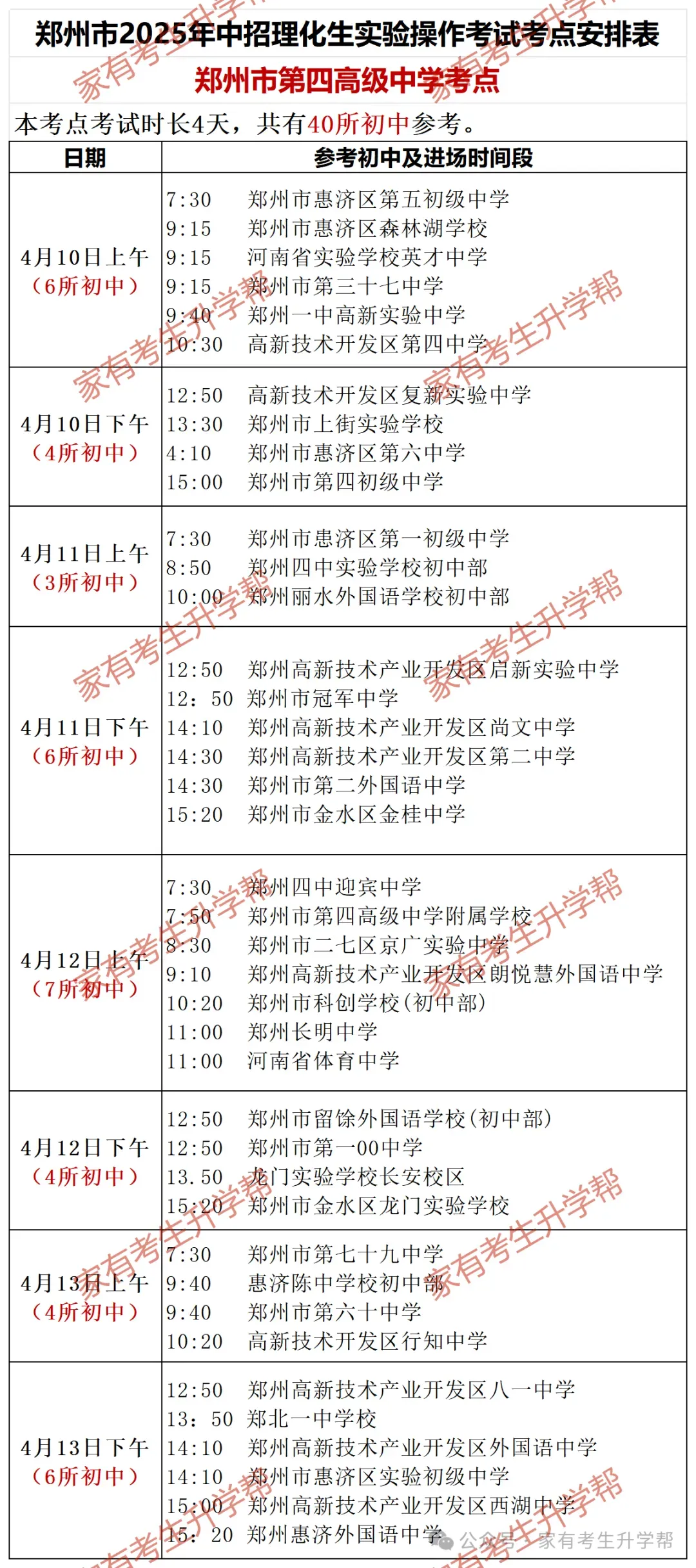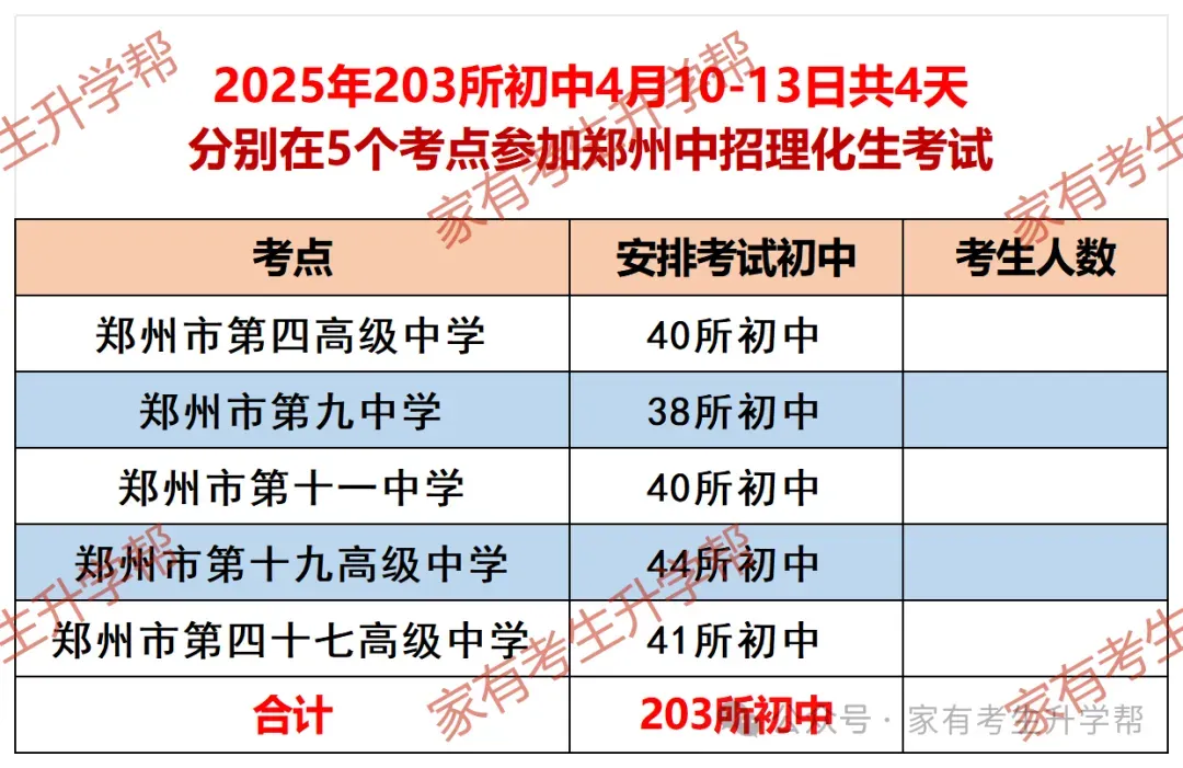 >郑州2025年4月10-13日5个中招理化生考点203所初中考试日程明细表