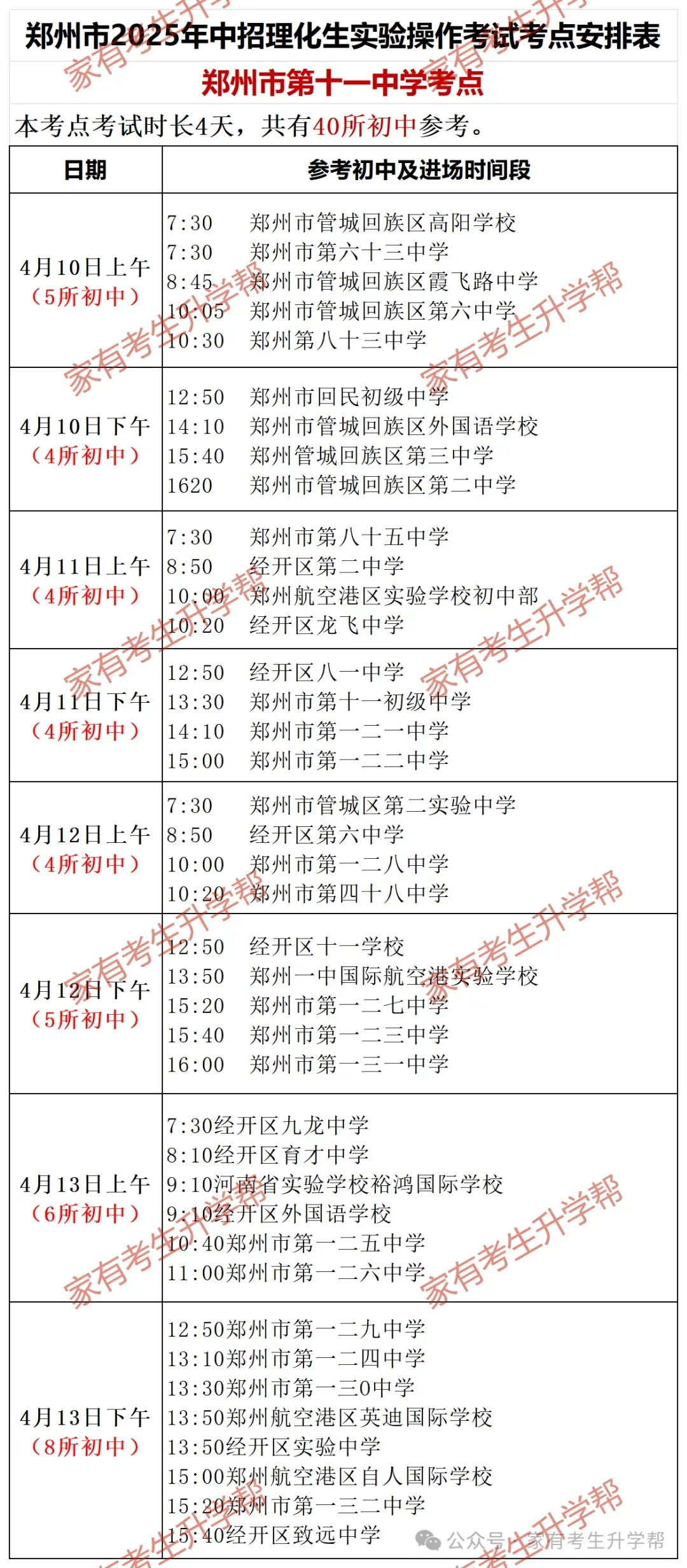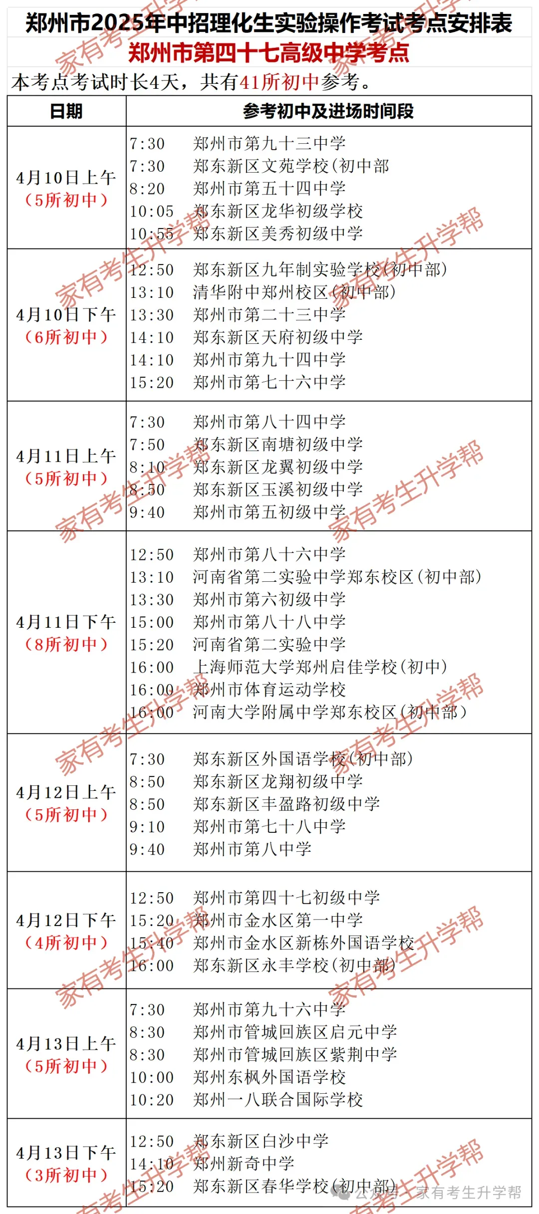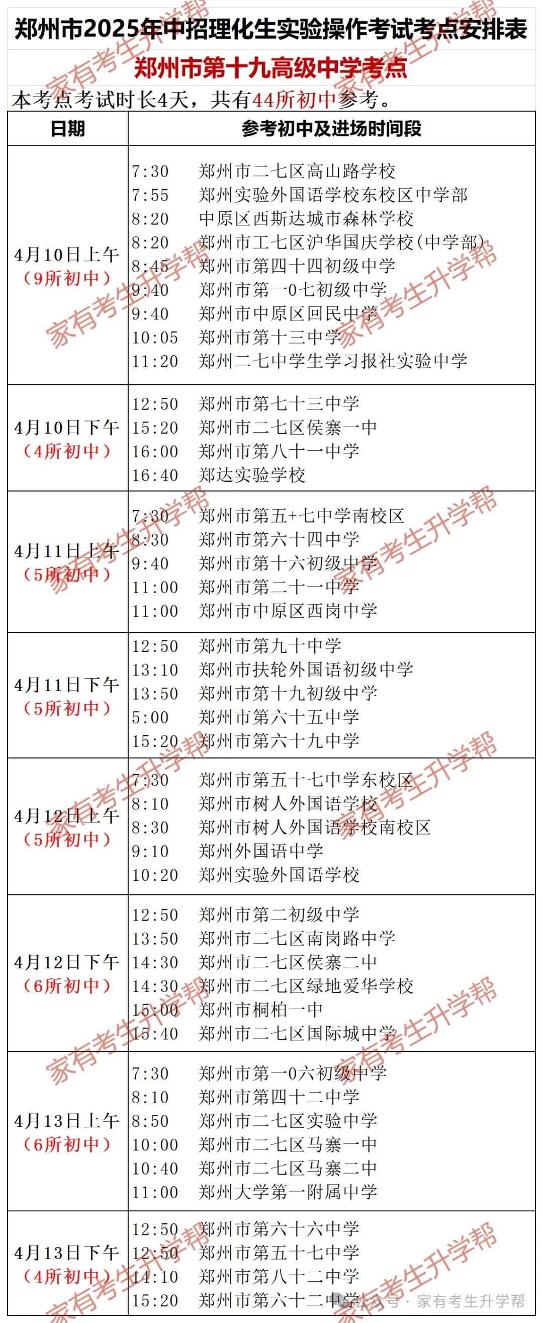 >郑州2025年4月10-13日5个中招理化生考点203所初中考试日程明细表