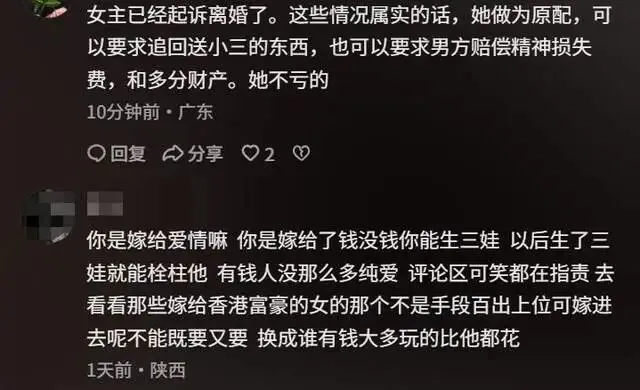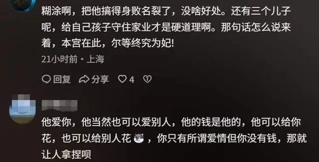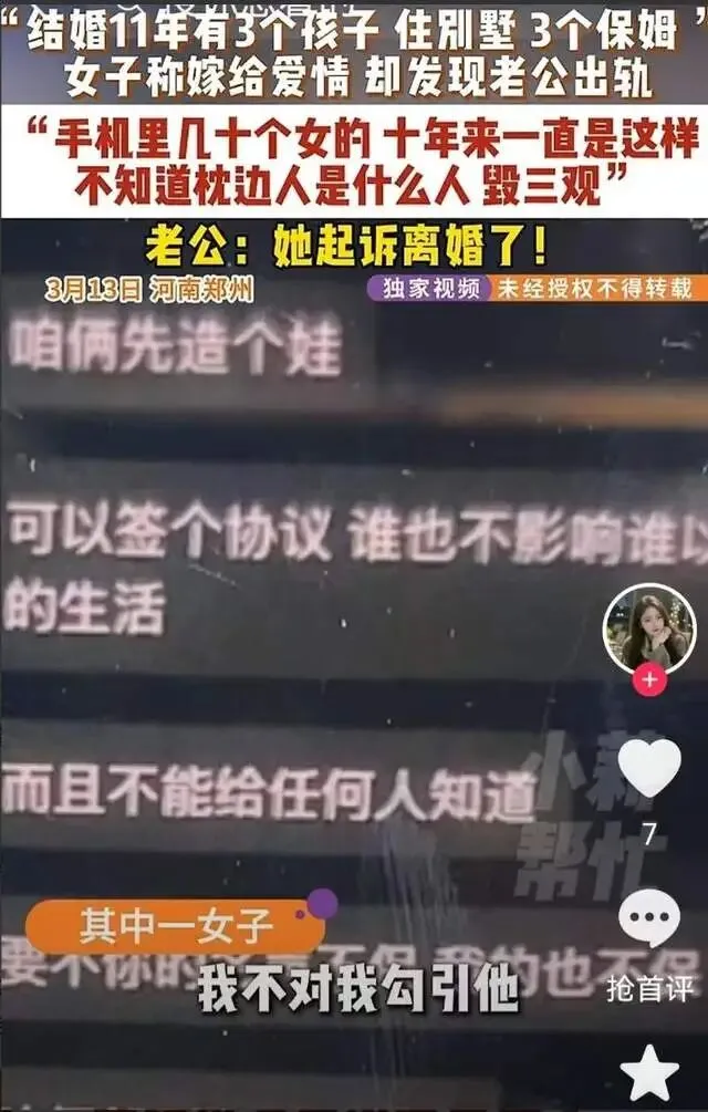 有些人把婚姻当成了舞台,自己是导演也是主角,妻子不过是台下鼓掌的观众。郑州的杨女士,就在这个观众席上坐了11年。她看着舞台上的丈夫,扮演好丈夫、好爸爸、成功商人的角色,看得入迷,甚至觉得自己是“嫁给了爱情”。直到有一天,她无意中走到后台,才发现这出戏远比她想的复杂。2015年,这出戏的序幕在国外拉开。杨女士和丈夫在留学时认识,两人相识不久就确定了关系,很快登记结婚。那时候的剧本很浪漫,男女主角一见钟情,爱情来得快,婚姻办得也快。回国之后,丈夫开始经营生意。他的父母是公职人员,家底殷实。几年下来,生意越做越大,公司销售额破亿,一家人住进了郑州的别墅,雇了三个保姆,负责做饭、打扫和带孩子。11年婚姻里,杨女士给丈夫生了三个孩子。在亲友眼里,她是“嫁得很好”的女人,别墅、生意、孩子、保姆,这样的配置算得上人生赢家。杨女士自己也信了这个剧本,她说:“我一直觉得我是嫁给爱情的。”舞台上的戏演得很逼真。丈夫每天出门谈生意,回家陪孩子,维持着成功商人该有的体面。保姆把家里打理得井井有条,孩子健康成长,家庭氛围看起来和和睦睦。杨女士坐在观众席上,看得很满意,却不知道舞台后面还有另一出戏在上演。今年,杨女士偶然发现丈夫还有一部平时很少用的手机。手机通讯录里存着大量女性的联系方式,聊天记录密密麻麻,里面全是转账记录和酒店开房信息。她仔细翻看,发现这些女性多达几十人。从聊天记录的时间来看,这些事不是最近才发生的,而是持续了很多年。杨女士越往下翻,越觉得荒谬——这些婚外关系几乎从他们结婚那天就开始了。换句话说,她在台下看了11年的戏,台上的人演了11年的双面人生。她以为自己是故事的女主角,其实不过是个不知情的观众。更让她震惊的是,丈夫在聊天中对一名女性说:“我们可以生个孩子,可以签协议,不影响彼此生活,不能让任何人知道。”杨女士后来联系了这名女性,对方承认跟她丈夫有关系,还说这样的女性有很多,她不是唯一一个。这出戏的剧本,比杨女士想象的复杂太多。她找到丈夫质问,想听他解释、道歉,想听他说这一切都是误会。但丈夫的态度让她更失望。他不觉得自己有什么问题,认为自己努力赚钱,让家人生活条件优越,享受生活很正常。他甚至在聊天中说过,自己就像“皇帝”,还说男人在外面都这样。在他看来,家庭生活不会受到影响,他还是会维持这个家,外面那些不过是“逢场作戏”。杨女士听完这些话,心彻底凉了。她终于明白,这11年她看的根本不是爱情剧,而是一个男人自编自导自演的帝王戏。他在舞台上演好丈夫,在后台演皇帝,几十个女人是他的后宫,而她就是那个被蒙在鼓里的傻子。夫妻俩开始频繁争吵。杨女士说,在一次冲突中,丈夫情绪失控,对她和孩子动了手。她被从别墅二楼推到一楼,劝架的女儿也被波及,事后她被送到医院治疗。冲突发生后,杨女士回娘家住了一段时间。等她再回到别墅时,发现门锁密码已经被换了,她进不了自己的家。杨女士这才发现,这出戏不仅要散场,连舞台都不让她上了。她本来没想过要离婚,也许是为了孩子,也许是对这段婚姻还抱有幻想。但经历了这一切之后,她发现有些戏真的不能再演下去了。她开始收集证据,向法院提起离婚诉讼。她说,在这段婚姻里,自己不仅承担了家庭责任,也在丈夫公司里参与经营,公司累计销售额达到2亿多元。如果离婚,她希望法院能综合考虑她在婚姻中的贡献,以及对方的行为。在很多人眼里,杨女士的婚姻看起来很体面,别墅、公司、生意、三个孩子,什么都不缺。但她现在才明白,舞台上的光鲜亮丽,跟后台的肮脏龌龊,可以同时存在。她一直以为自己是这出戏的女主角,其实她连配角都算不上,只是个坐在台下鼓掌的观众。而那个在台上演了11年的男人,现在还觉得自己没错。他觉得自己有钱,就该享受生活,男人在外面都这样,妻子应该理解。他大概到现在都没明白,有些戏可以演,但人生不是戏。11年的婚姻,11年的欺骗,几十个女人,私生子计划,“皇帝”心态,这些加在一起,就是一个男人的自私和膨胀。有些人赚了点钱,就觉得自己可以无法无天。他们把婚姻当成道具,把妻子当成摆设,把外面的女人当成消遣,还觉得这一切理所应当。杨女士现在要做的,就是从这个观众席上站起来,走出这个剧场,不再为这出烂戏鼓掌。信息来源:小莉帮忙,《河南一男子享受"皇帝"待遇,养几十个女人,还说有钱就要这样做》,2026-03-16
