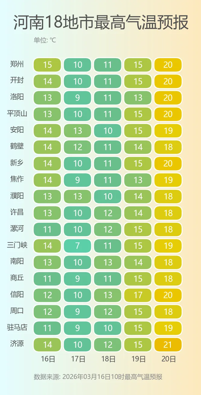 ⭐3月16日,据河南气象消息,本周河南先雨后晴,升温是本周的主旋律,20日多地最高气温接近20度,周末将进一步上升至20度以上,南部部分地区甚至有望冲上25度。详情>>