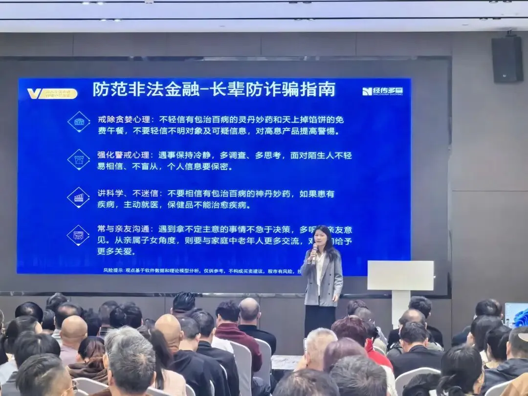 在金融知识科普环节中,主讲老师聚焦于频发、易发在群众身边,贴近群众生活等角度的骗局,如常见的低价购物、免费赠送、冒充亲友诈骗等,透过贴近老百姓日常生活场景案例帮助投资者深刻认识到金融诈骗的隐蔽性与危害性,并进一步向投资者宣传如何采取有效的防诈技巧与应对措施,呼吁投资者不轻信、不盲信天上掉馅饼的免费午餐、树立正确的投资理念、日常注重保护个人信息、遇到可疑情况常与亲友沟通,真正守护好自己的钱袋子。