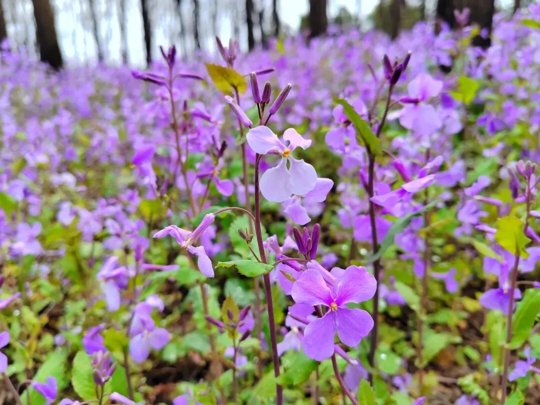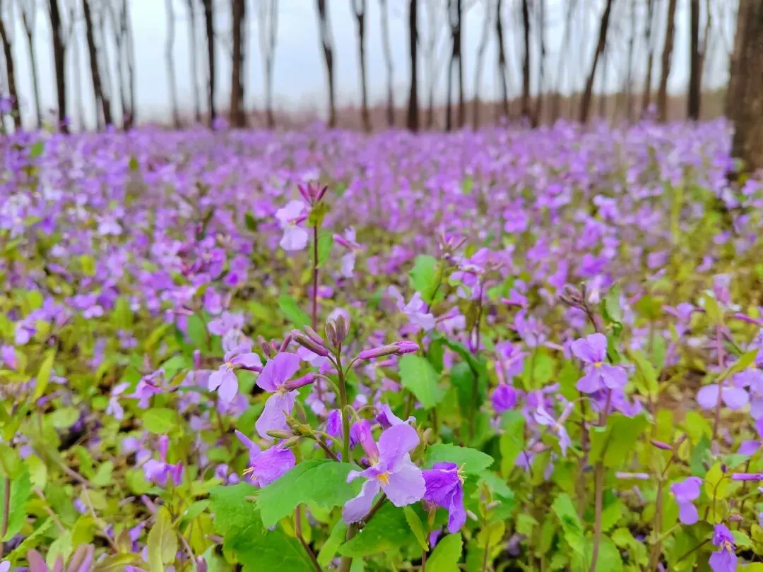 大片大片的二月兰汇聚在一起,便成了震撼人心的紫色海洋。风一吹,花浪轻轻起伏,紫色的花瓣随风摇曳,如流动的紫霞般如梦似幻。