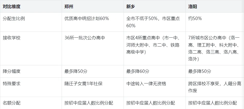 - 洛阳:优质高中分配生比例约50%,城市区7所公办高中(洛一高、理工附中、科大附中等)参与分配,名额按初中应届毕业生人数比例分配。