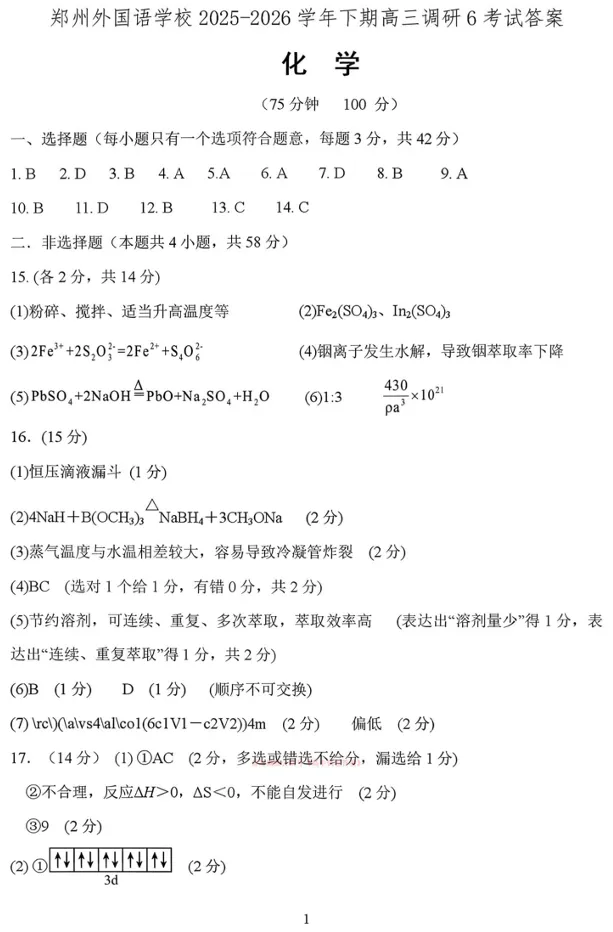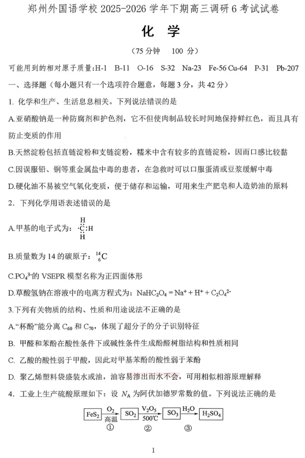 >河南省郑州外国语学校2025-2026学年下期高三年级调研6考试试卷(3.12-3.13)化学试卷