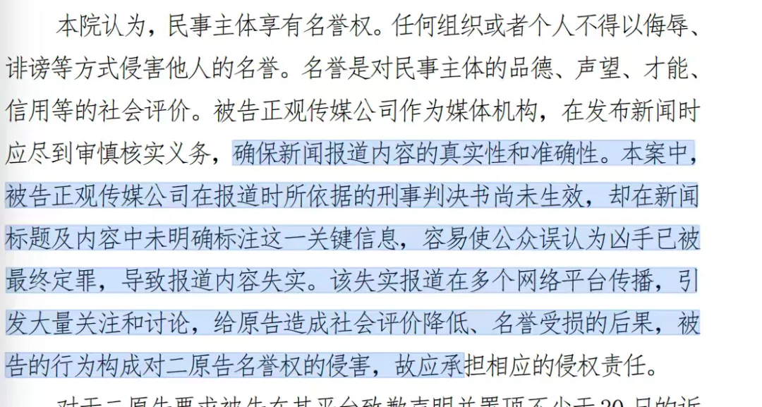 因此,报道“失实”,构成名誉侵权,正观新闻需赔礼道歉、赔偿损失共计3万元。