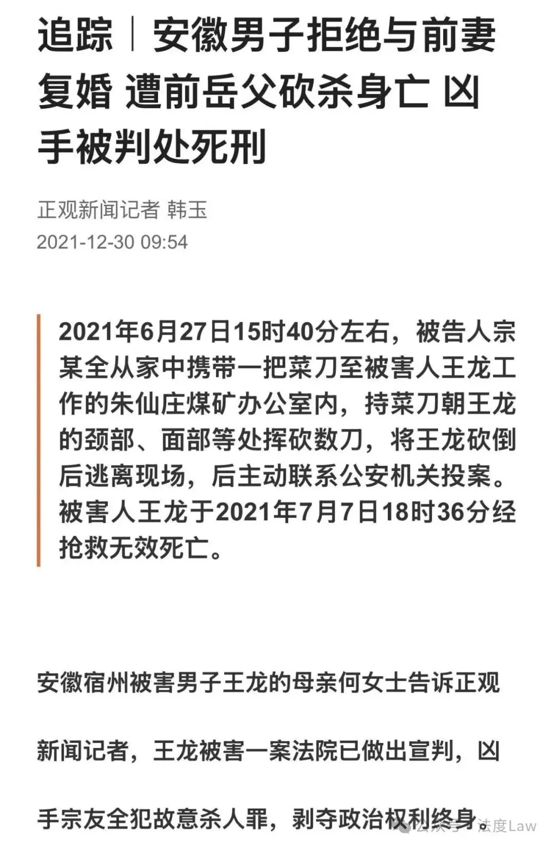 正观新闻对此案进行了追踪报道。2021年12月30日,他们发布报道《追踪|安徽男子拒绝与前妻复婚 遭前岳父砍杀身亡 凶手被判处死刑》。