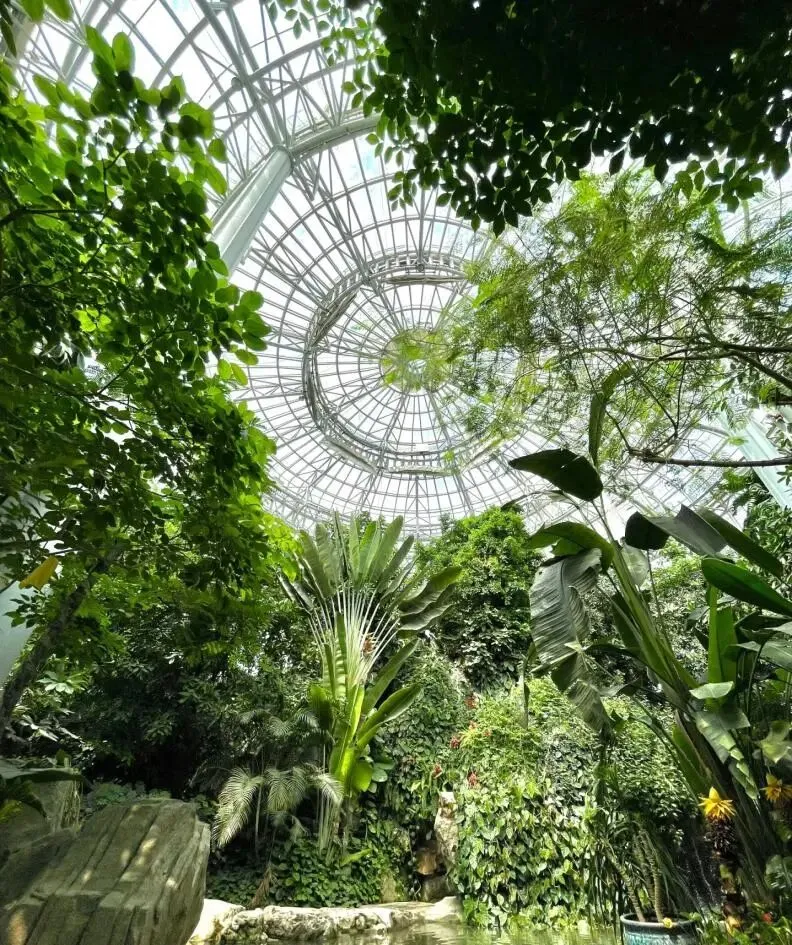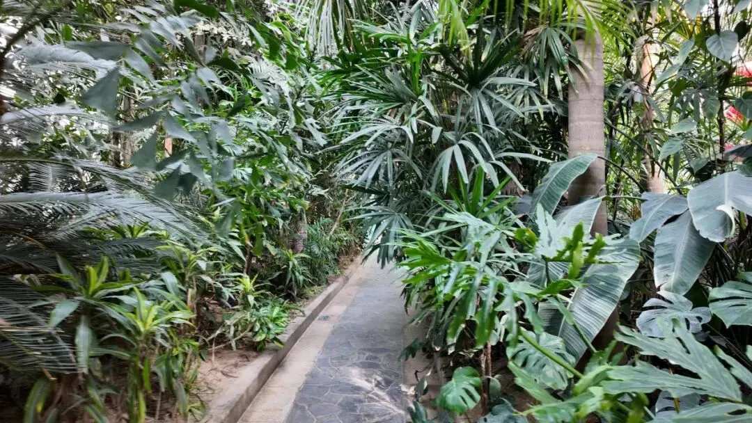 推门而入,温热的湿润空气瞬间包裹全身。抬头一看——你不得不仰起头,才能望见那些高大植物的树顶。棕榈、榕树、芭蕉……它们舒展着宽大的叶片,像一把把撑开的巨伞,把阳光筛成细碎的光斑,洒在林间小径上。