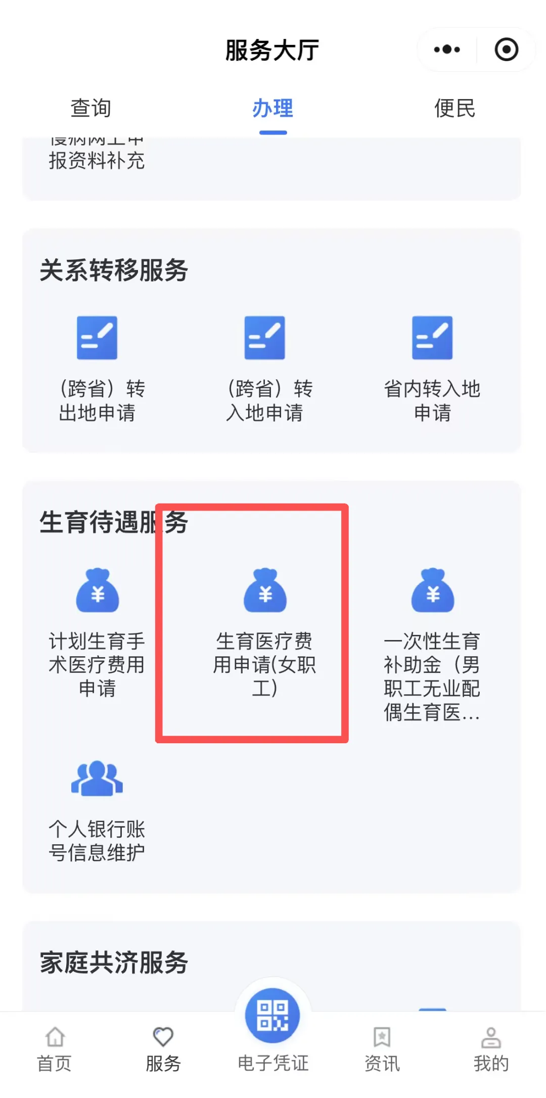 进入我要办页面后,往下滑,点击【生育医疗费用申请】,按照提示进行信息填写上传即可申请。
