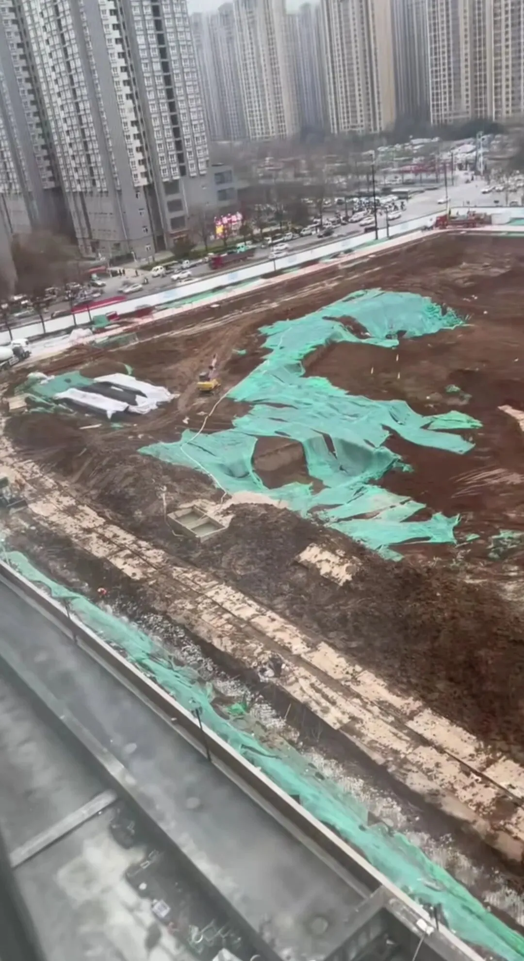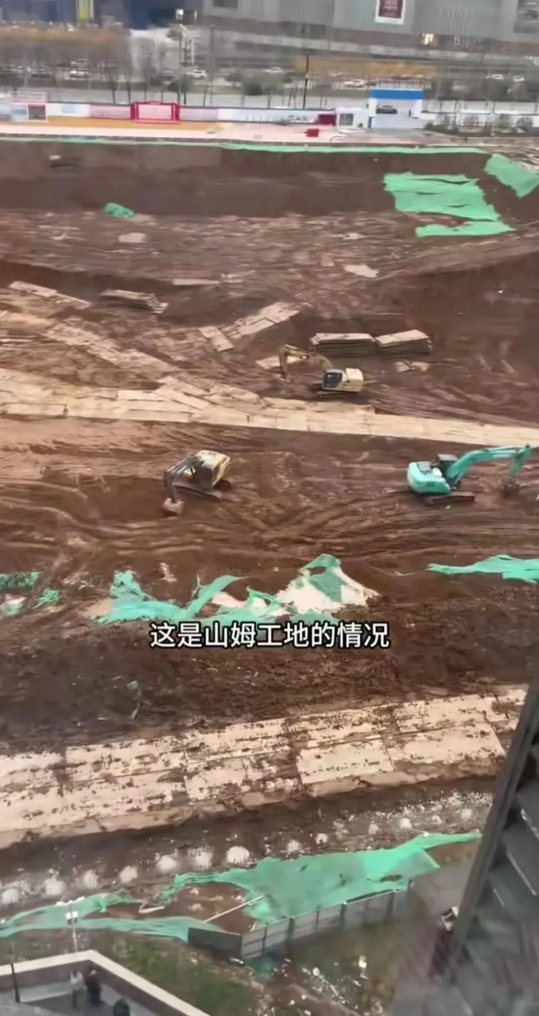 3月16日,有网友在附近楼上往下拍工地施工进度。通过视频可以发现,现场几台挖机嗡嗡地在挖坑作业。
