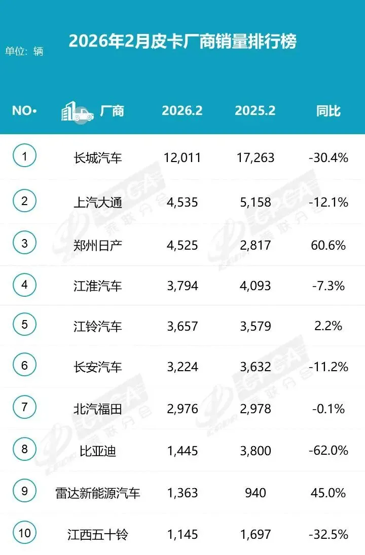 在春节因素的影响下,2026年2月国内皮卡市场产销虽有放缓,但出口却逆势飘红,郑州日产等企业凭借新能源布局,在市场中站稳了脚跟。2026年2月,国内皮卡市场迎来季节性调整,行业整体呈现产销放缓态势。据相关数据显示,当月全国皮卡销售4.1万辆,较去年同期下降13.2%;生产4.2万辆,同比下降3.1%。